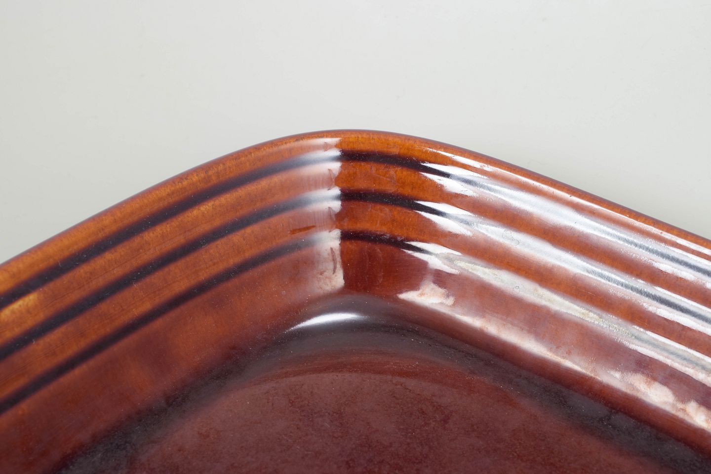 Stort rektangulært serveringsfad i stentøj fra Rustik-serien med varm brun glasur og karakteristisk rillet kant. Model formgivet i 1970’erne med funktionelt og tidløst svensk formsprog.