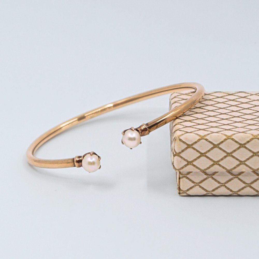 Bernhard Hertz; A bangle of 8k gold, set with two pearls. Inner measures: 6,1 cm x 5,1 cm. Stamped "BH BH". Please contact us if you're looking for anything specific. What you see on our webside is just a small selection.