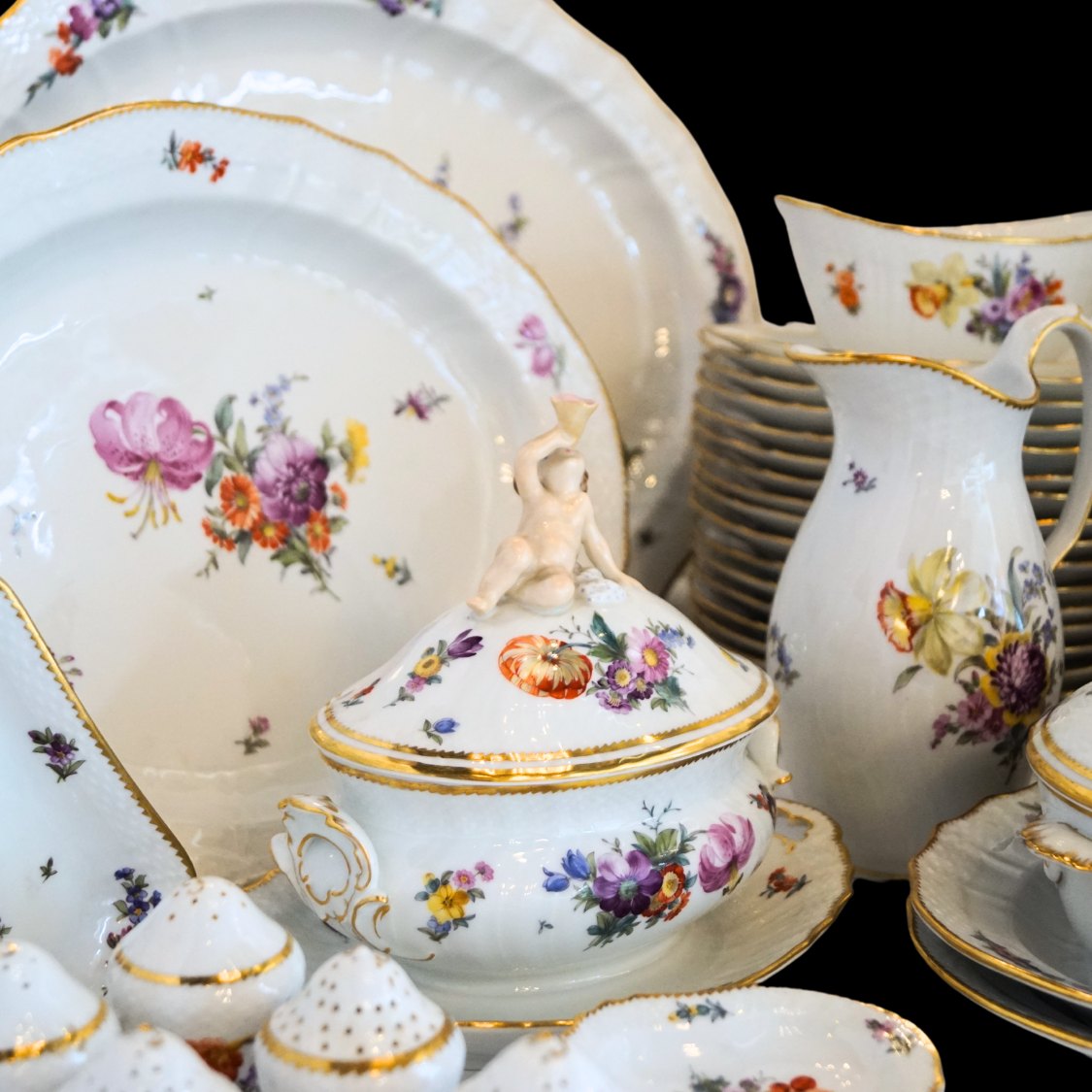 Royal Copenhagen, Tung Saksisk blomst porcelæn; komplet spisestel 16 pers.