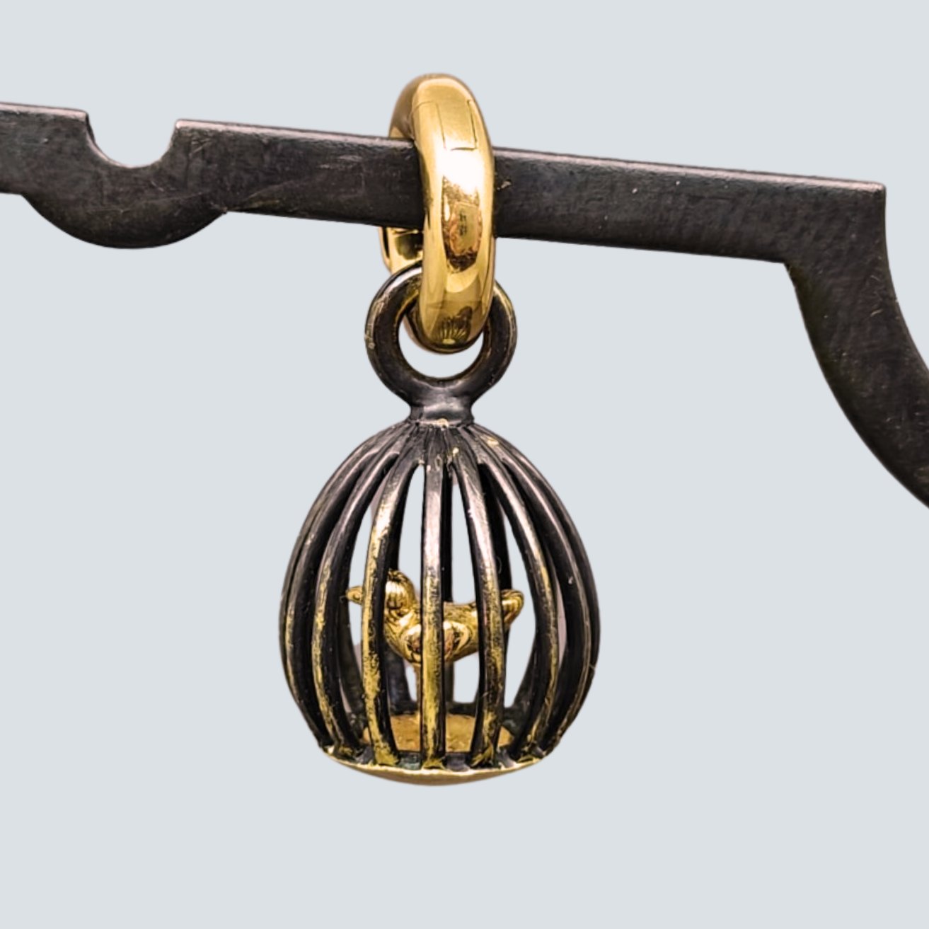 Ole Lynggaard; Sweet drop charm til at sætte på armbånd eller halskæder. i 18 kt. guld, med diamant i bunden. Fuglebur med lille guldfugl inden i. Buret med oxideret overflade. Kan åbnes i øsknet, så den også kan sættes på en perle- eller stenkæde.