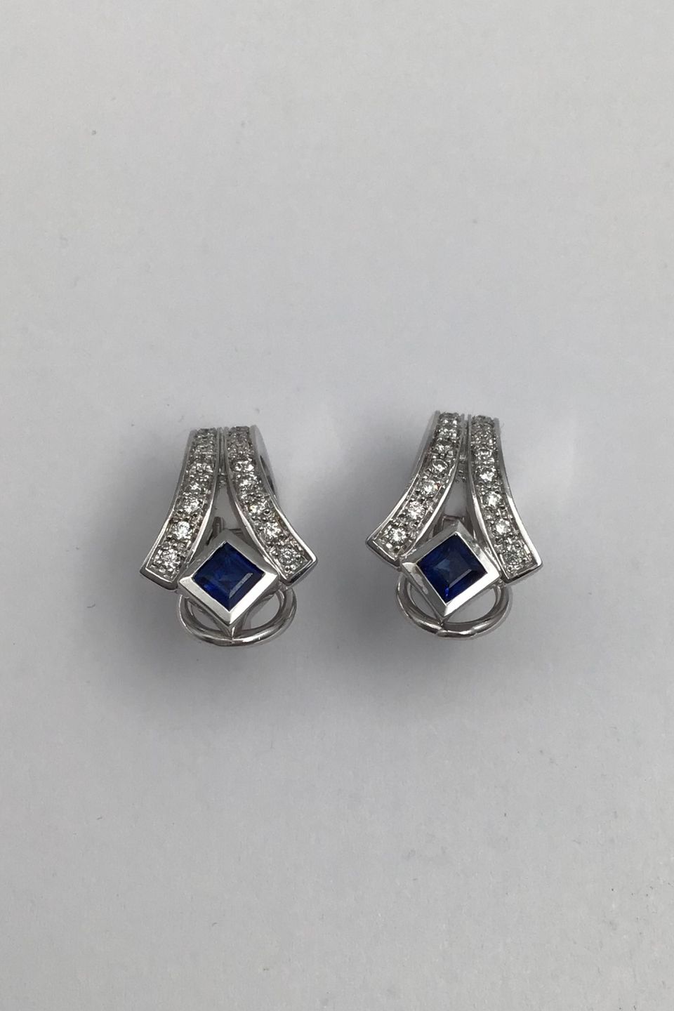 Danish 14 K Whitegold Ear Studs w Saphir & Diamonds Measures 2 cm x 1.2 cm (0.78 inch x 0.47 inch) Combined Weight 9.3 gr (0.33 oz)