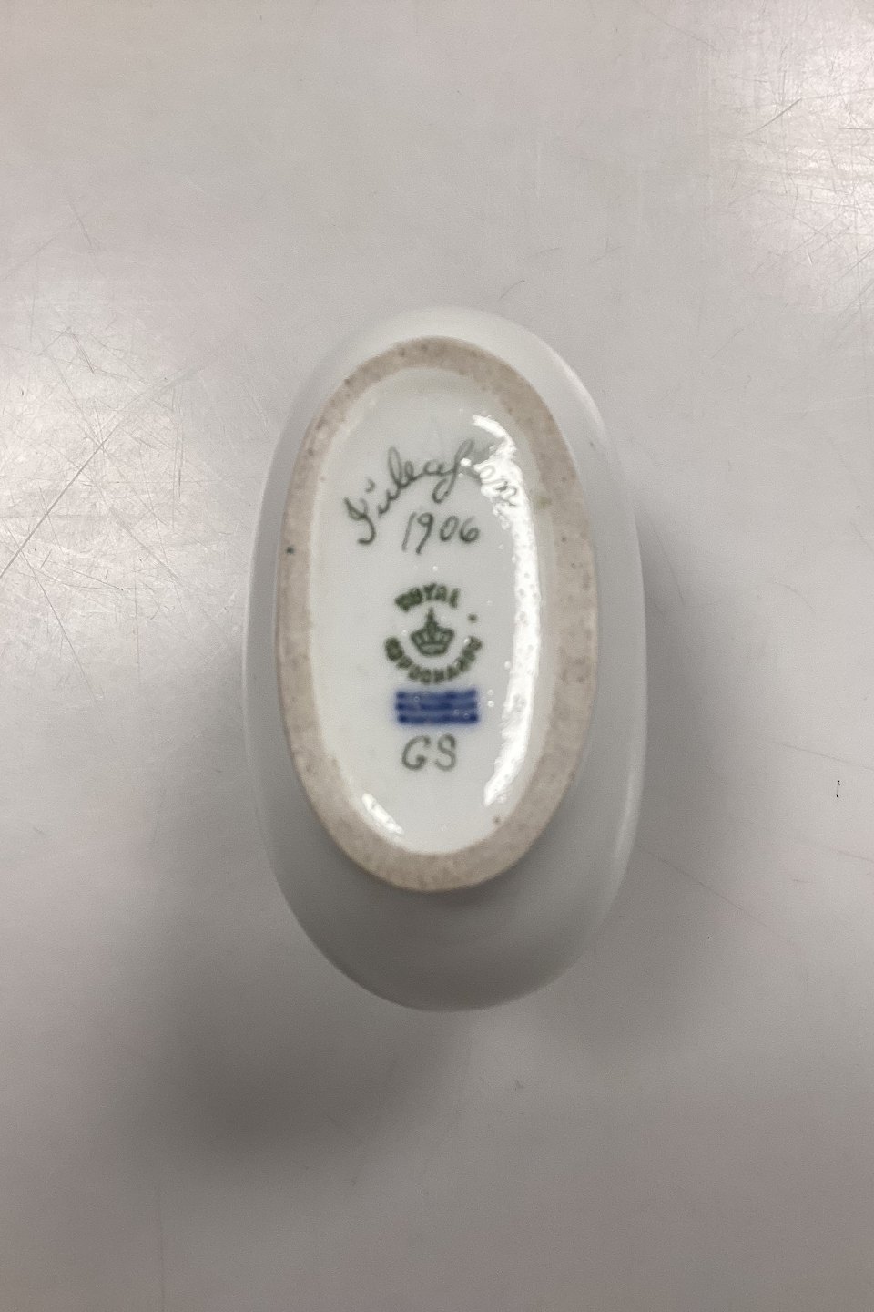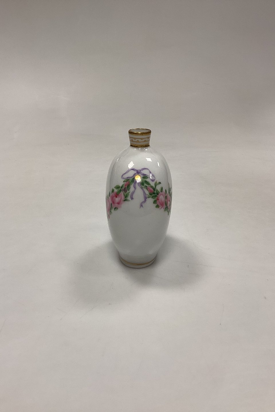 Royal Copenhagen Privately Painted Vase. Motif with pink rose garland. Inscription at the bottom: Christmas Eve 1906, GS. Measures 10 cm / 3.93 in.
