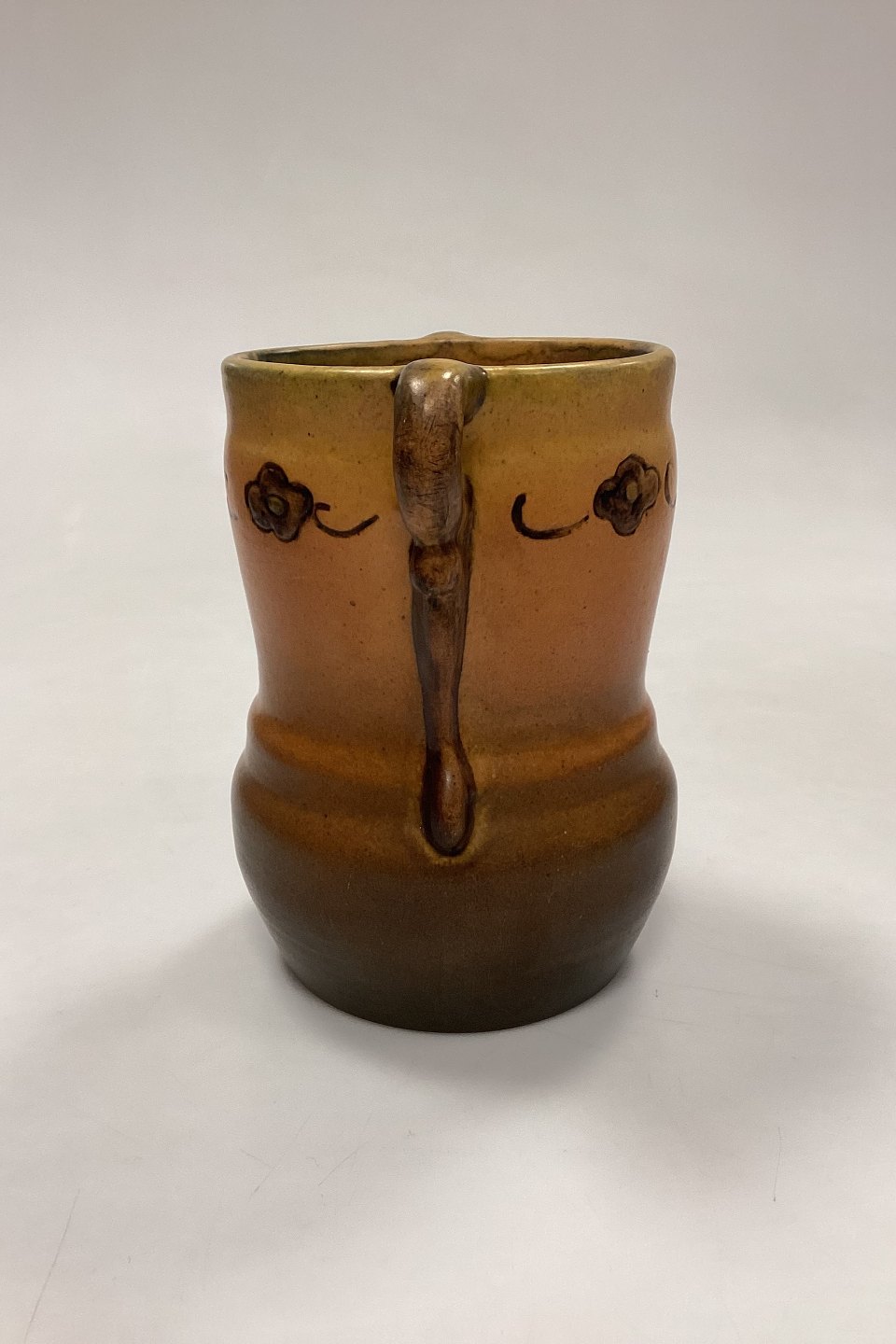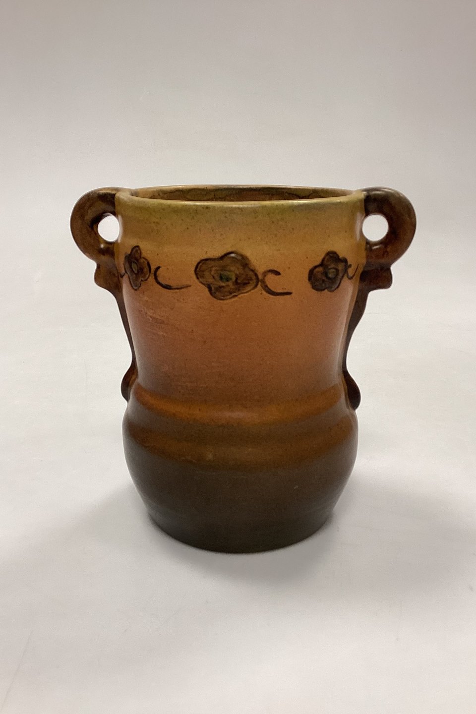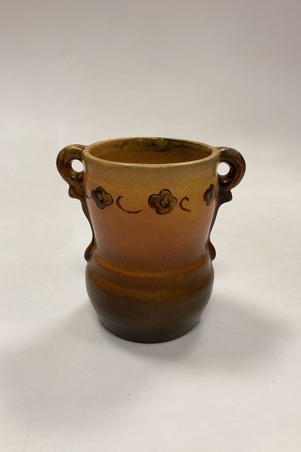 P. Ipsens Enke Vase No. 412. Stentøj med gul og brun glasur, med prægede blomster i kanten.