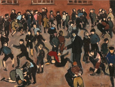 "Markedsscene og scene fra skolegård" Olie malerier på lærred.