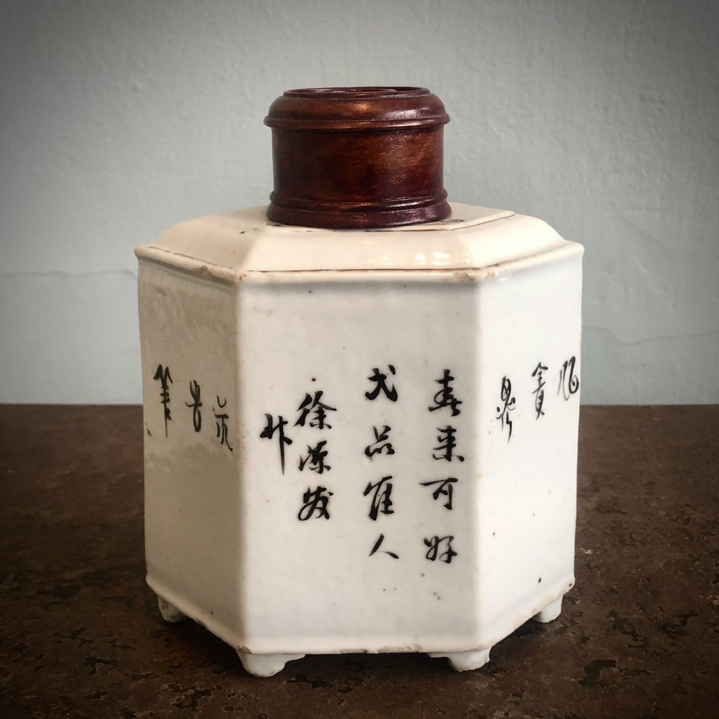 Itemnumber: 494628Chinese caddy of porcelain. Hexagonal body decorated with flowers, bird motifs in enamel colors and Chinese characters. Lay of wood. Red stamped at the bottom. H. 14/15 cm. B. 13 cm. D. 8 cm.