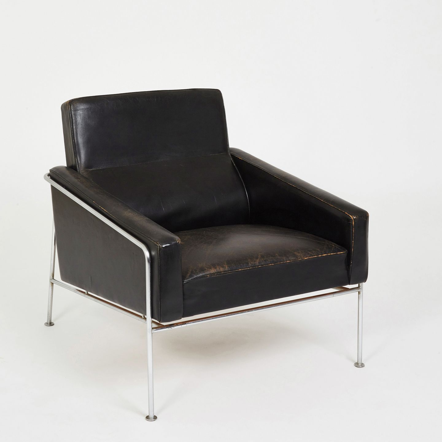 Arne Jacobsen. Lufthavnsstol i originalt sort patineret læder, stel af forkromet stål.Udført i tresserne.