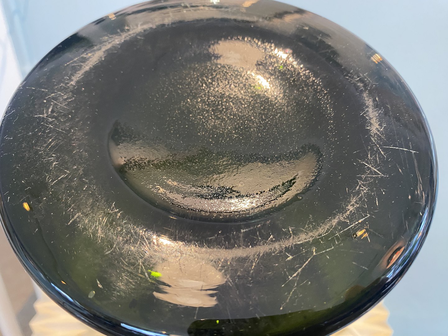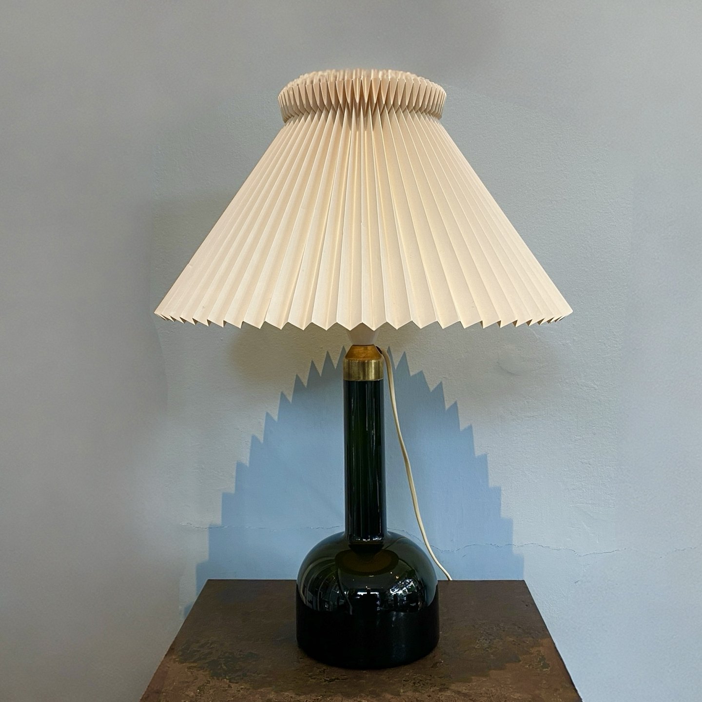 Varenummer: 622824Sjælden Le Klint bordlampe med lampefod af mørk grønt glas monteret med plisseret skærm.