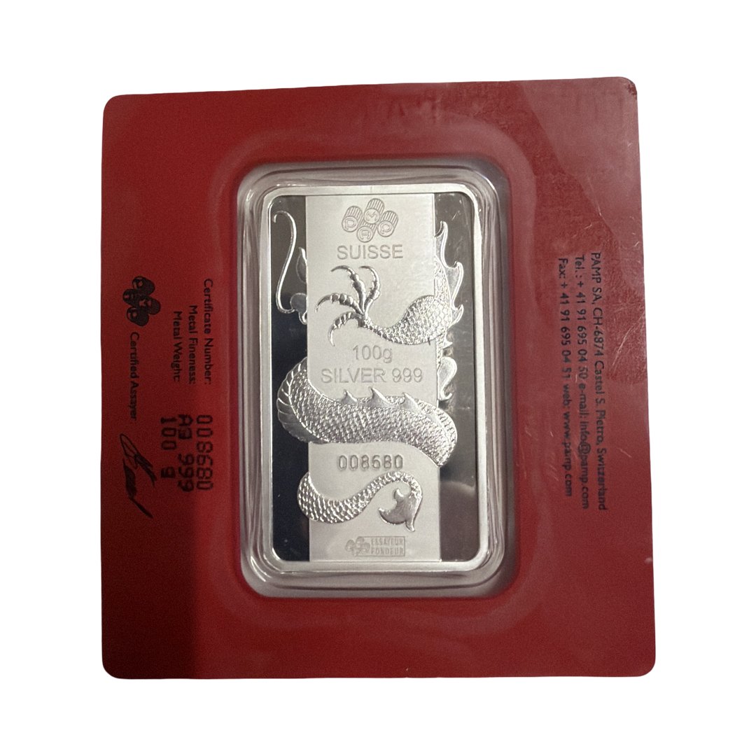 PAMP 100 gram sølvbar 0.999 fin sølv Nummeret