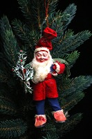 Antikt juletræspynt fra omkring år 1900 i form af julemands glansbillede og tinsel. . .