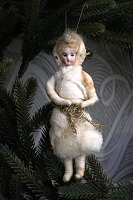 Gammelt juletræspynt fra omkring år 1940 i form af lille barn svøbt i klæde lavet i pap , gips og papir.