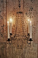 Old French prism chandelier, decorated with lots of clear glass prisms, chains and glass beads. . .