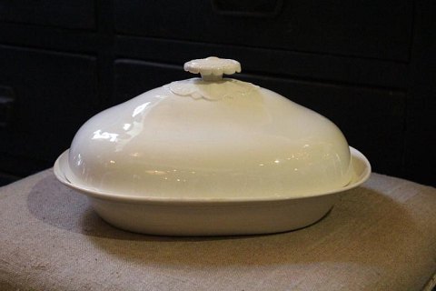 Old oval dish in cream colored earthenware with fine patina. Measurements: H: 16cm. L&W: 28x21.5cm. Has a small tear in the lid !