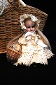 H: 18cm. with light here has porcelain arms and legs and holds a wicker basket in her hand.