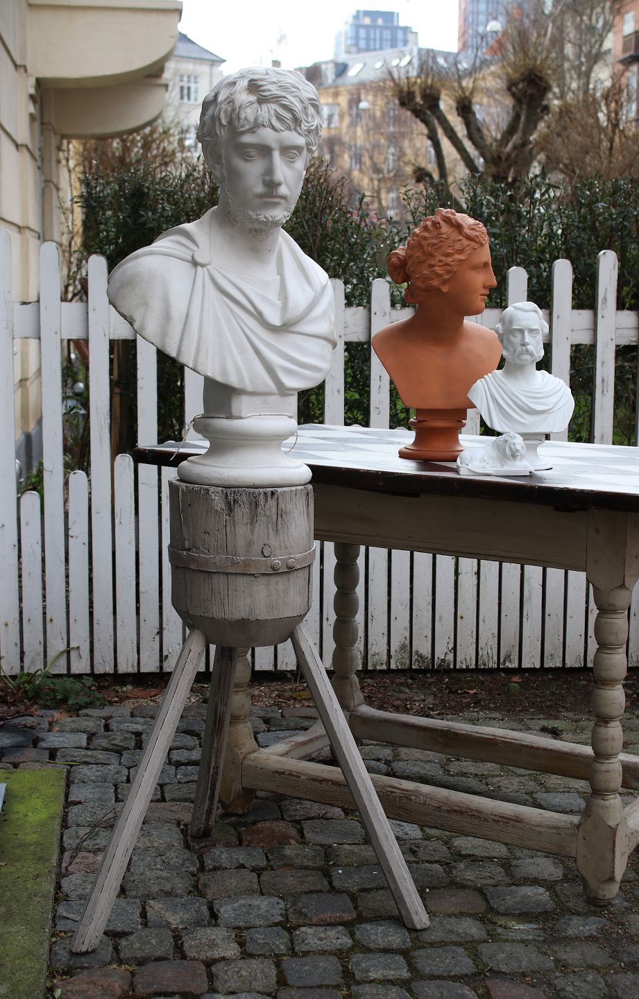 Gammel huggeblok i træ med lys gråpatineret bemaling.