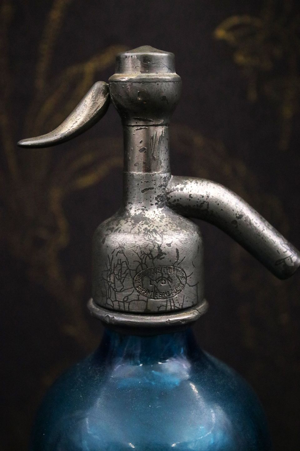 Dekorativ , sjælden fransk mini glas sifon fra begyndelsen af 1900 tallet i turkisblå farve med graveret skrift på siden af sifonen og en fin patina.