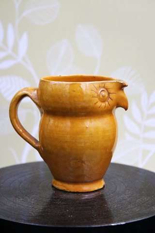 Fadet er håndlavet med håndtag, hældetud, og smuk gule glasur på indersiden. H: 21cm. Dia.: 46cm.