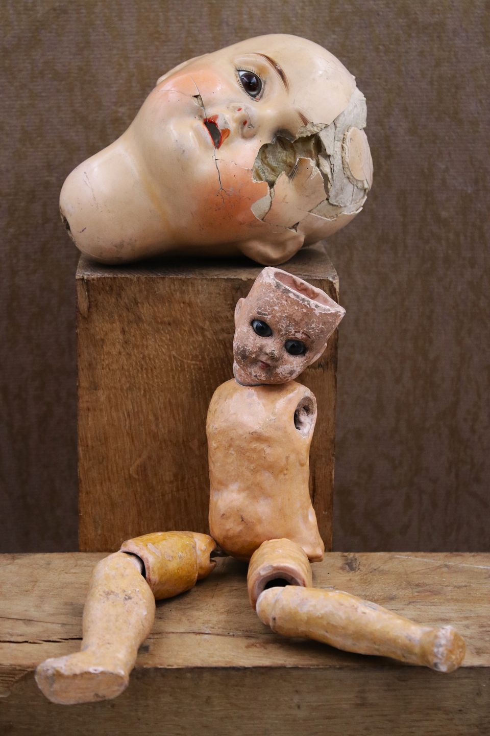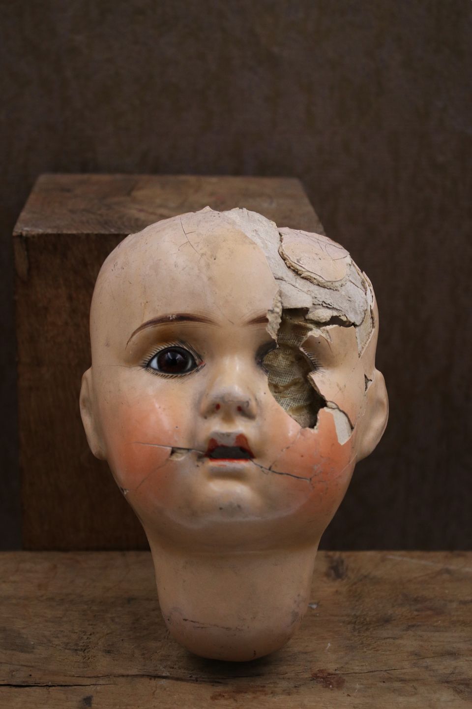 Dukker hovedet er gået itu på den ene side , men dekorativ i alt sit forfald som en lille kunst installation i en gammel fransk glas globe.