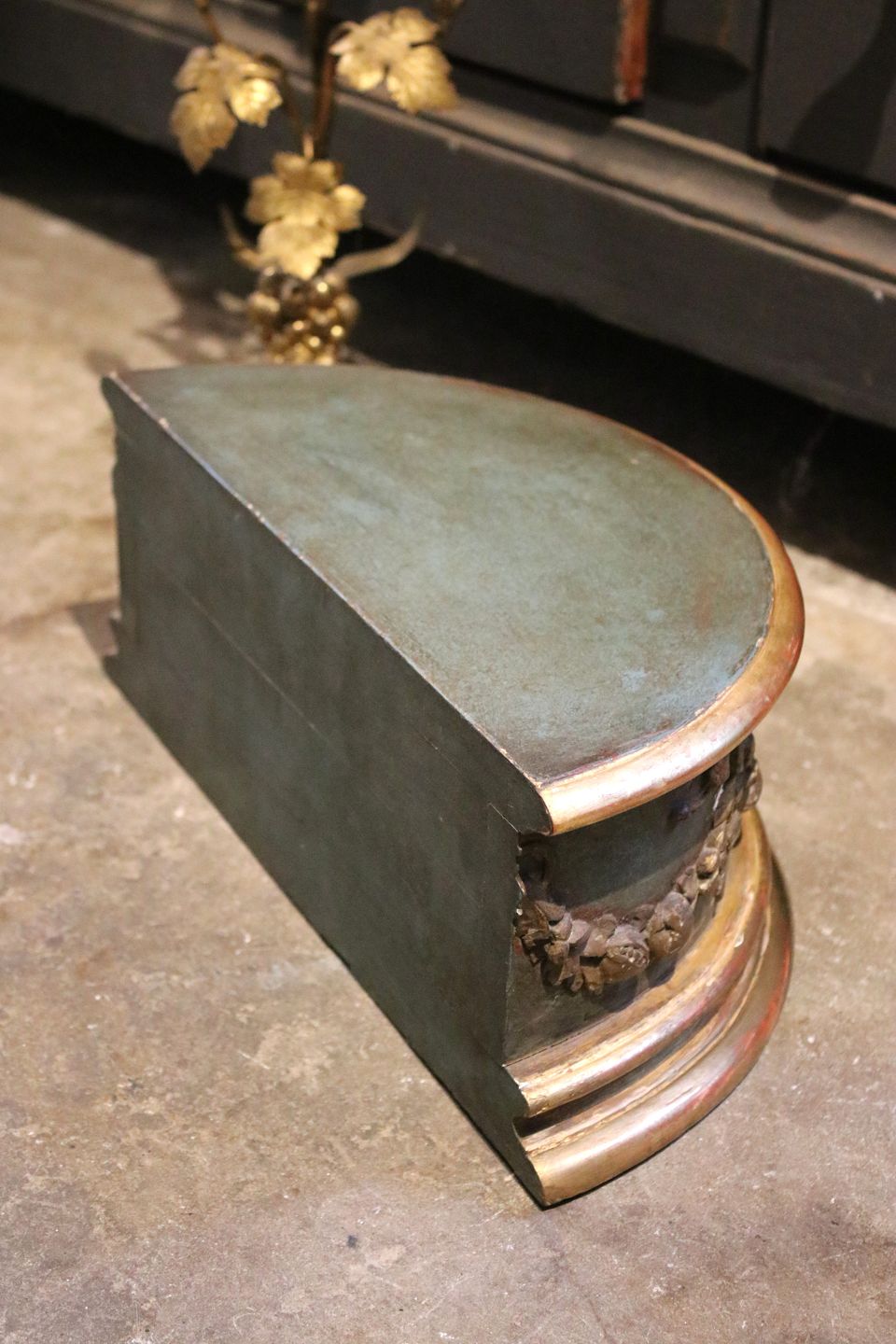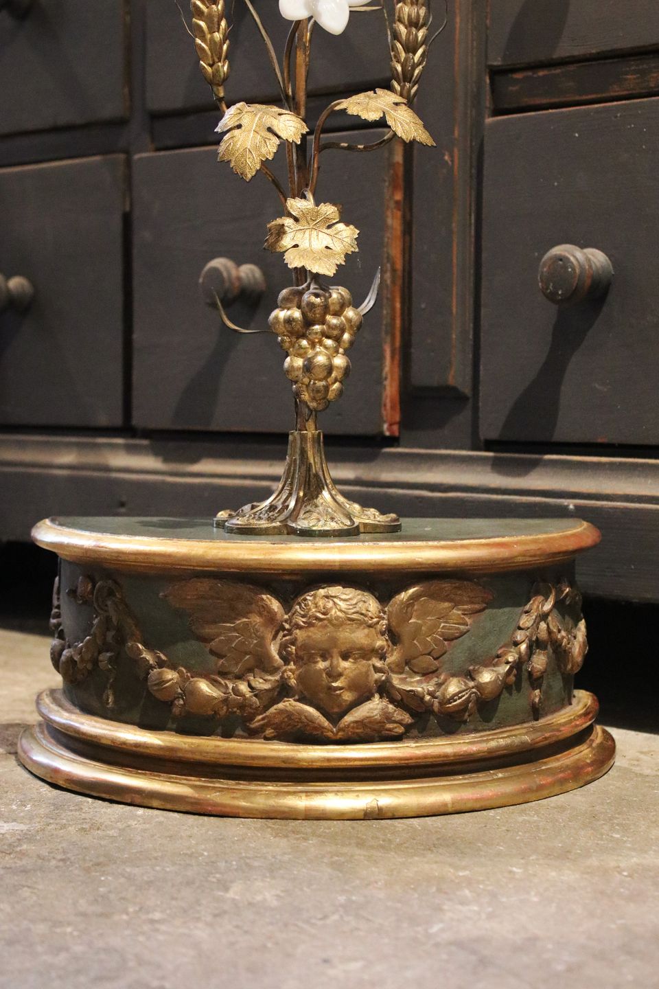 Dekorativ , fransk 1800 tals piedestal i træ med engle motiv , gammel original blå bemaling og guld dekorationer , samt en fin patina.