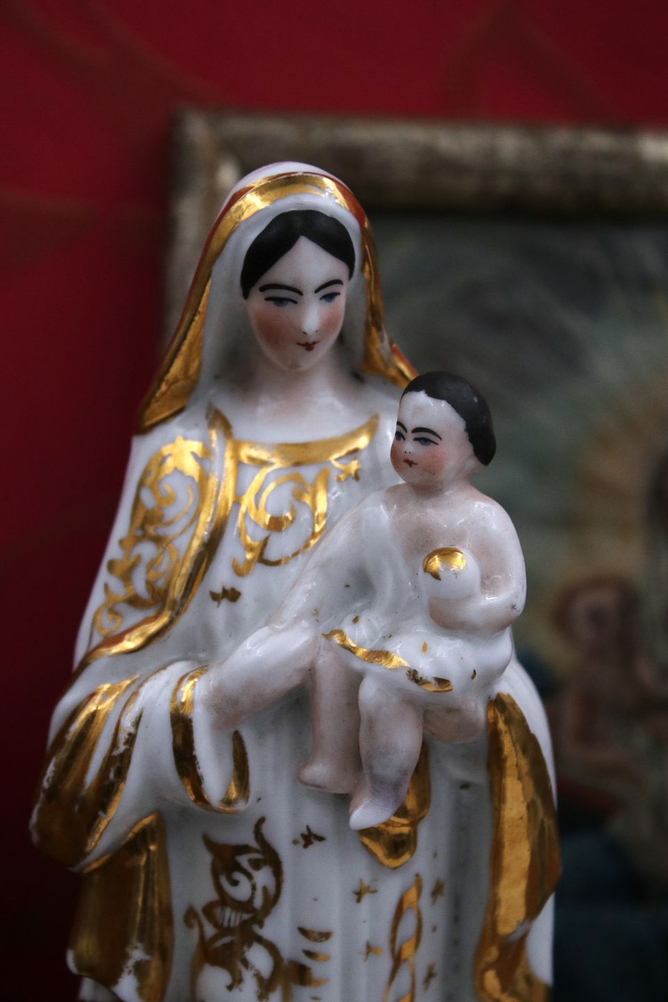 Decorative, old Madonna figurine in porcelain of the Virgin Mary with the baby Jesus. Height: 22cm. Item number: Lille Madonna figur nr.1