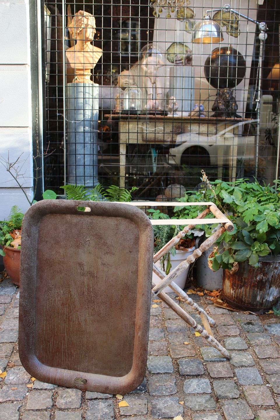 stor rå metalbakke på toppen. H: 68cm. L&B: 76,55,5cm.