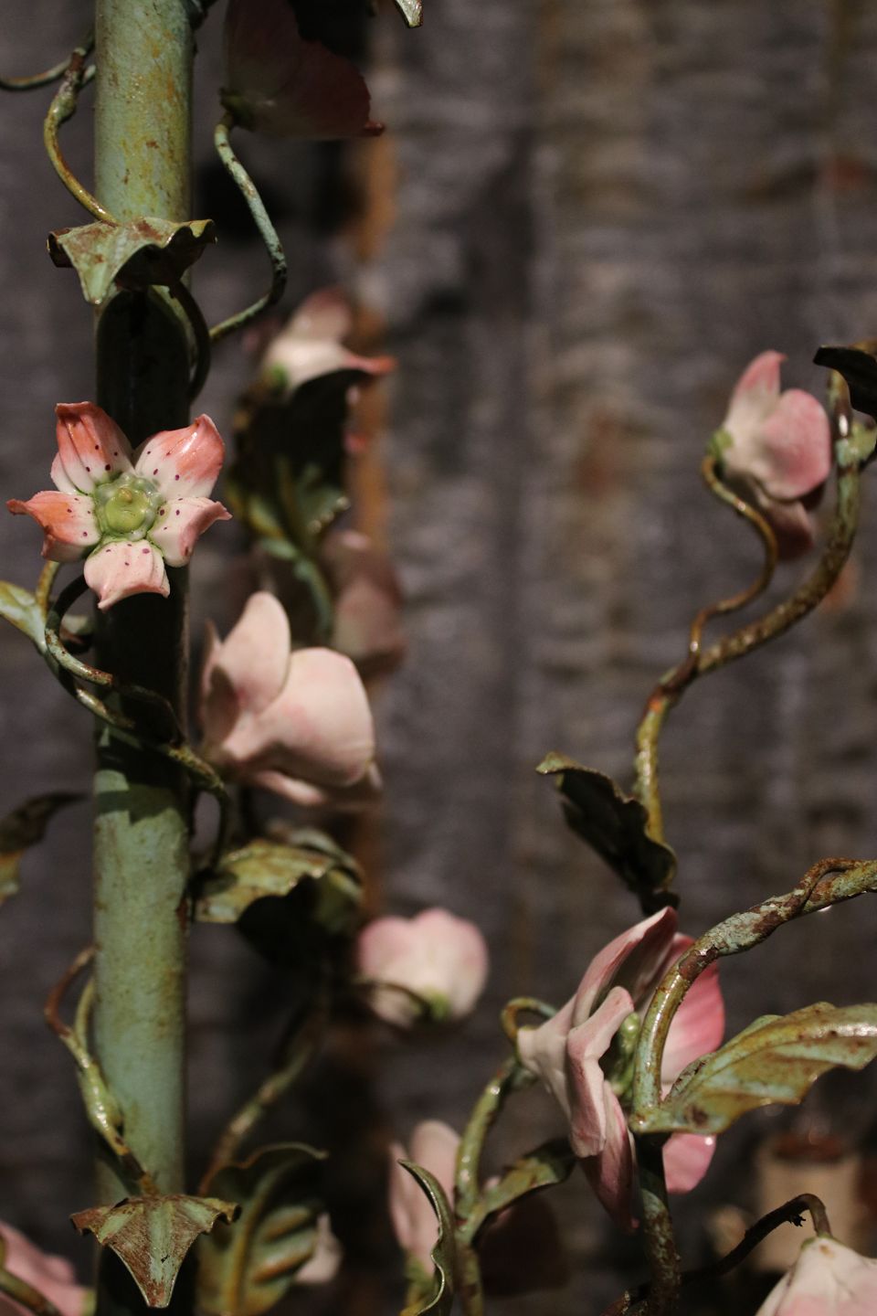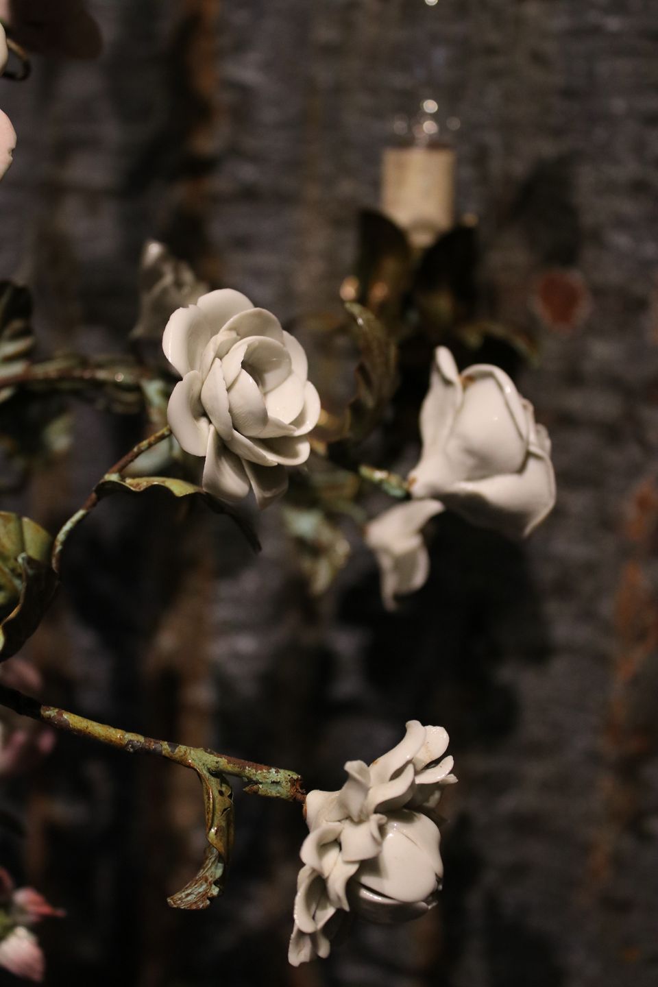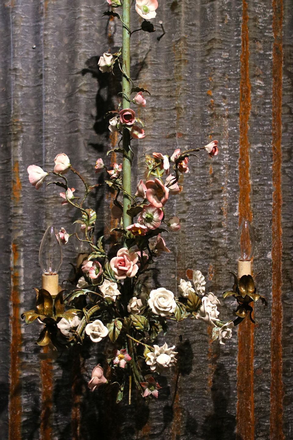 Gammel fransk lysekrone med base i grønmalet metal stel dekoreret med en masse små fine farvet / hvide porcelænsblomster.