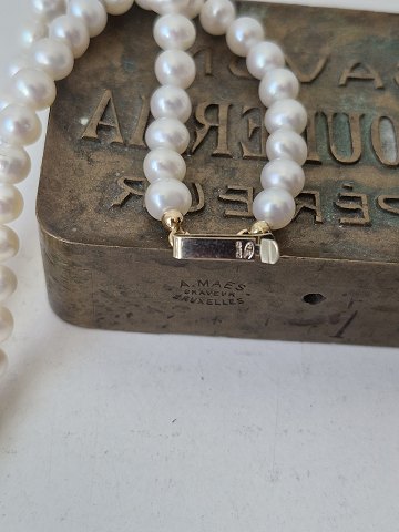 Very beautiful two-strand cultured pearl bracelet with clasp in 18 kt gold. Stamped 750. Length 20 cm. Diameter of the pearls 5.7 mm. Measurements of the clasp itself 6 x 12 mm.