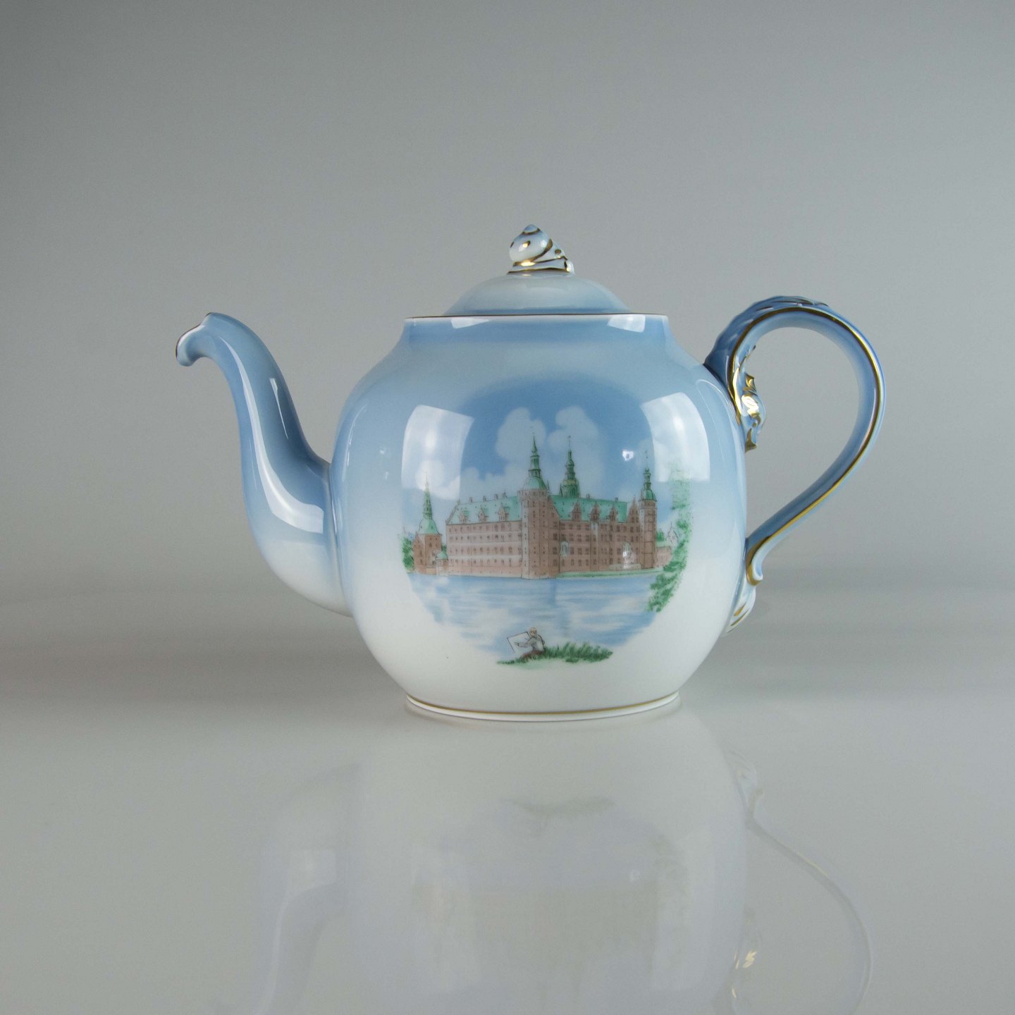 Tekande i porcelæn fra Danmarksstellet med guldkant og motiv af Kronborg. Nr. 656/3562