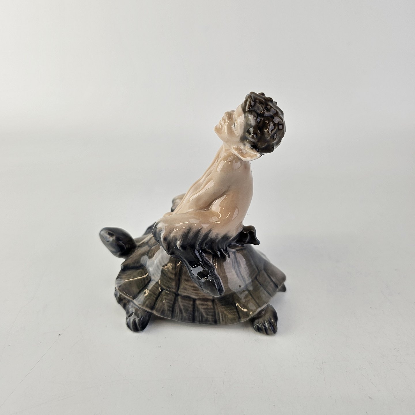 Kongelig figur i porcelæn med motiv af en faun som sidder på ryggen af en skildpadde