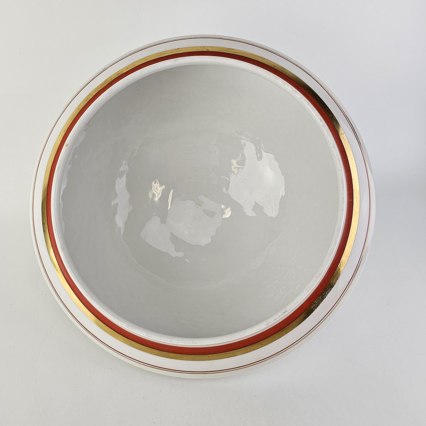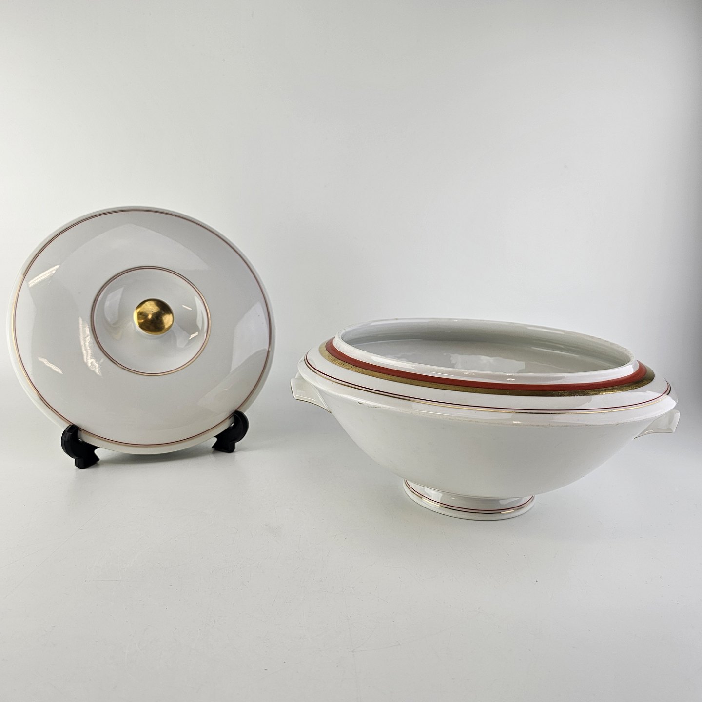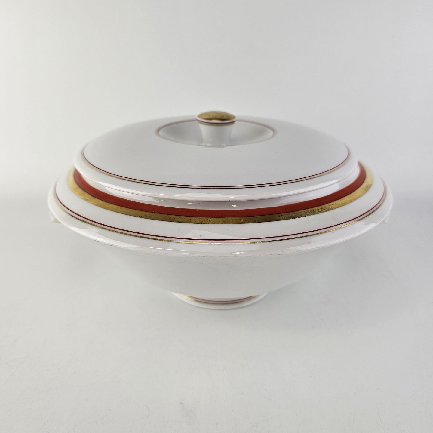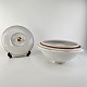 Service i glat hvidt porcelæn dekoreret med rød & guld bånd samt to tynde streger.