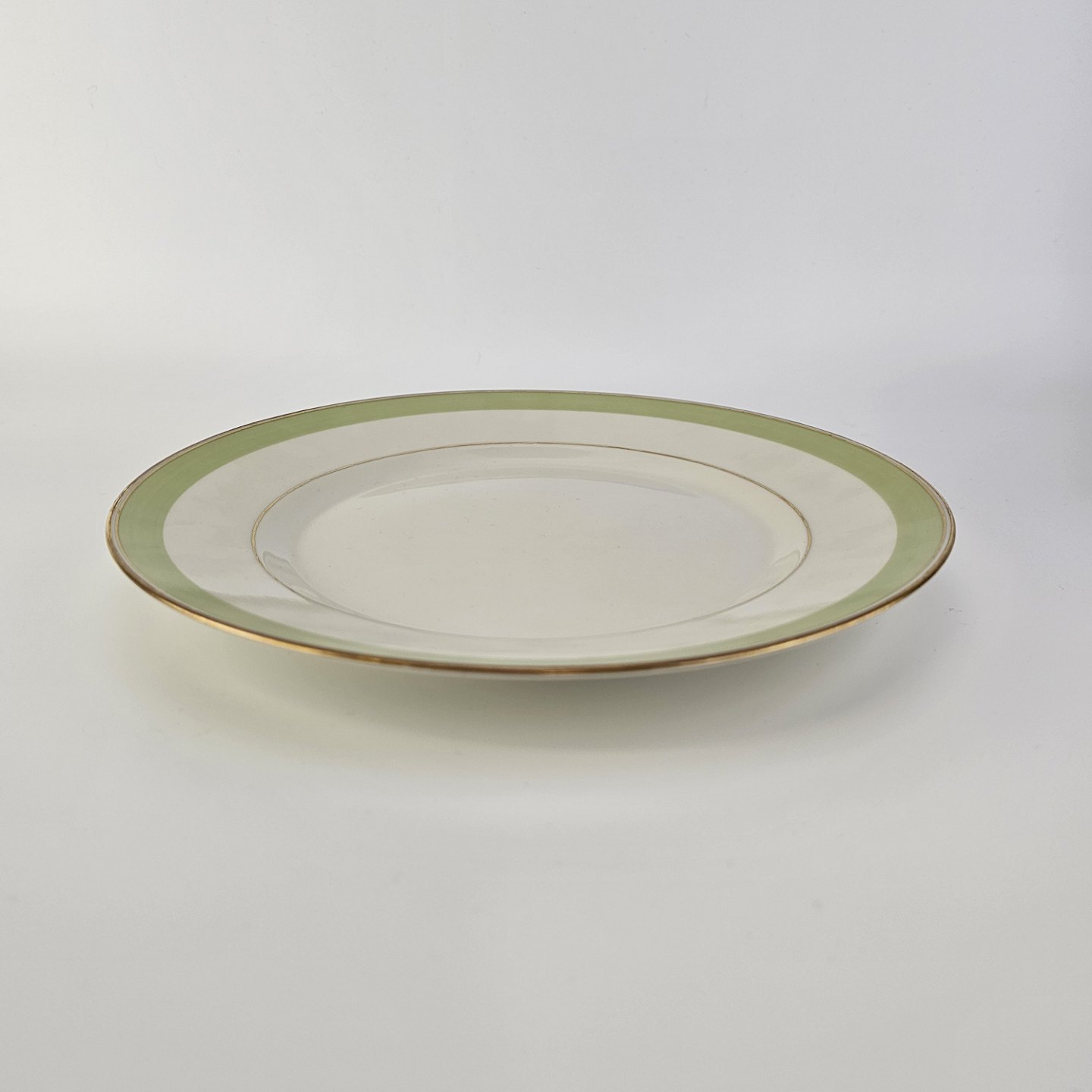 Stellet er fremstillet i glat cremefarvet porcelæn med lysegrøn dekoration og guldkant