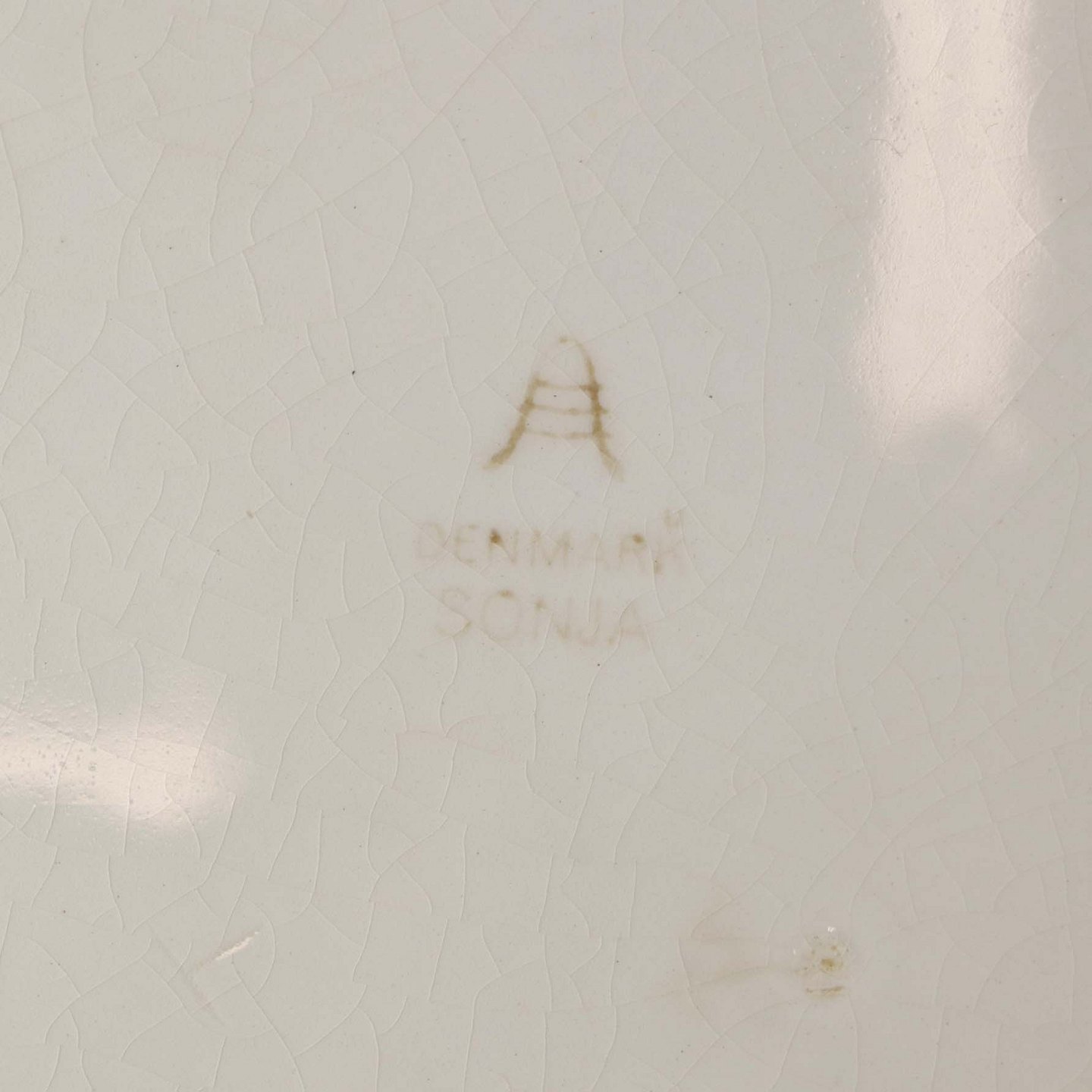 Fremstår med krakkeleringer i glasuren samt mindre bruninger under glasuren og på bagsiden.