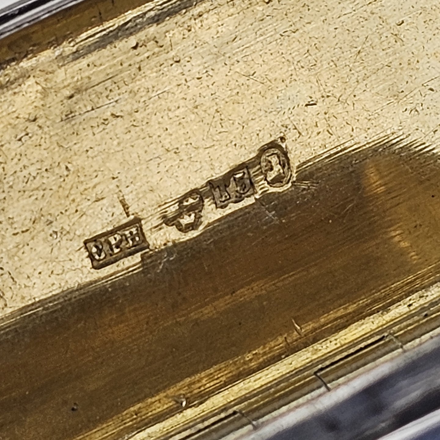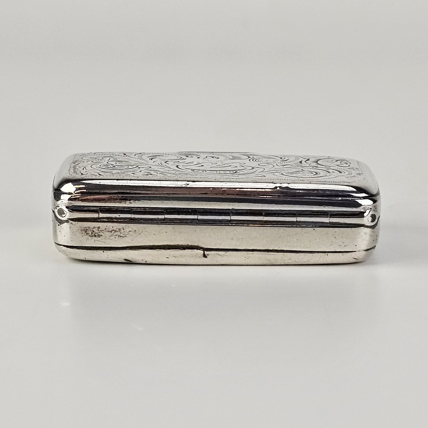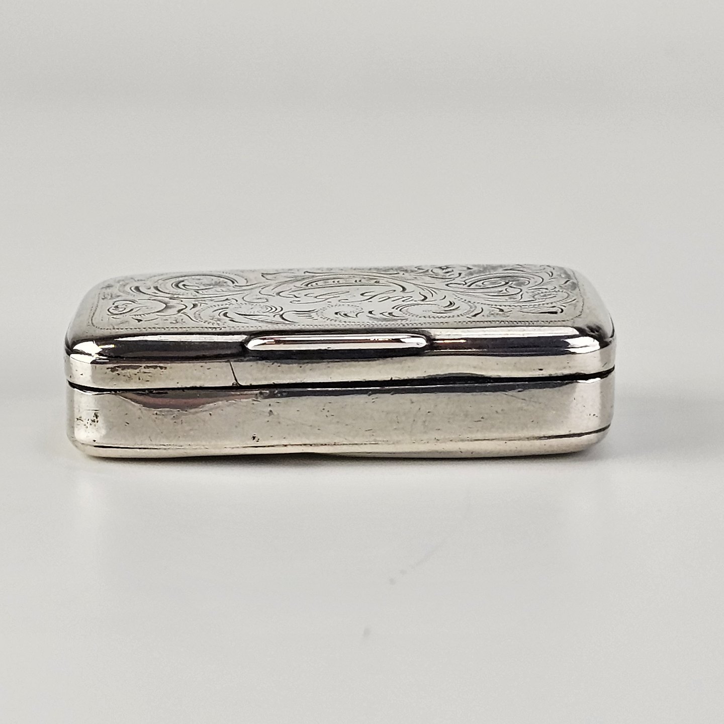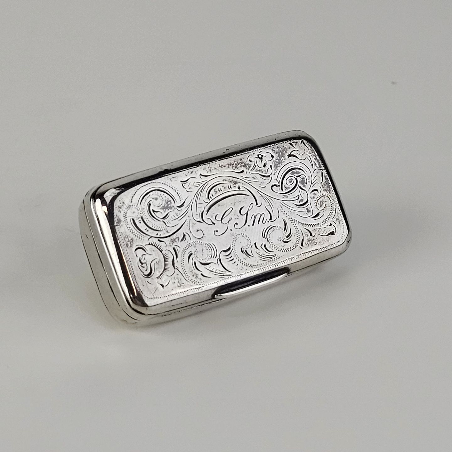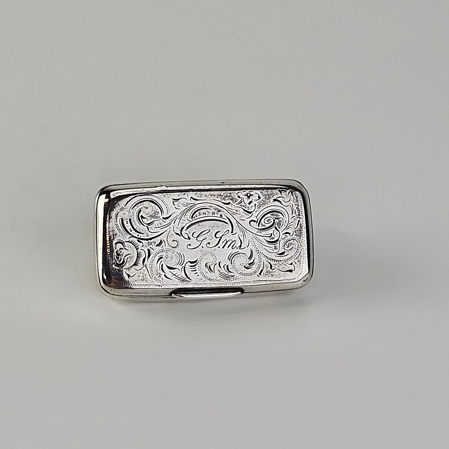 Pilleæske i sterling sølv med bladmotiv, indgraveret G.S.M.