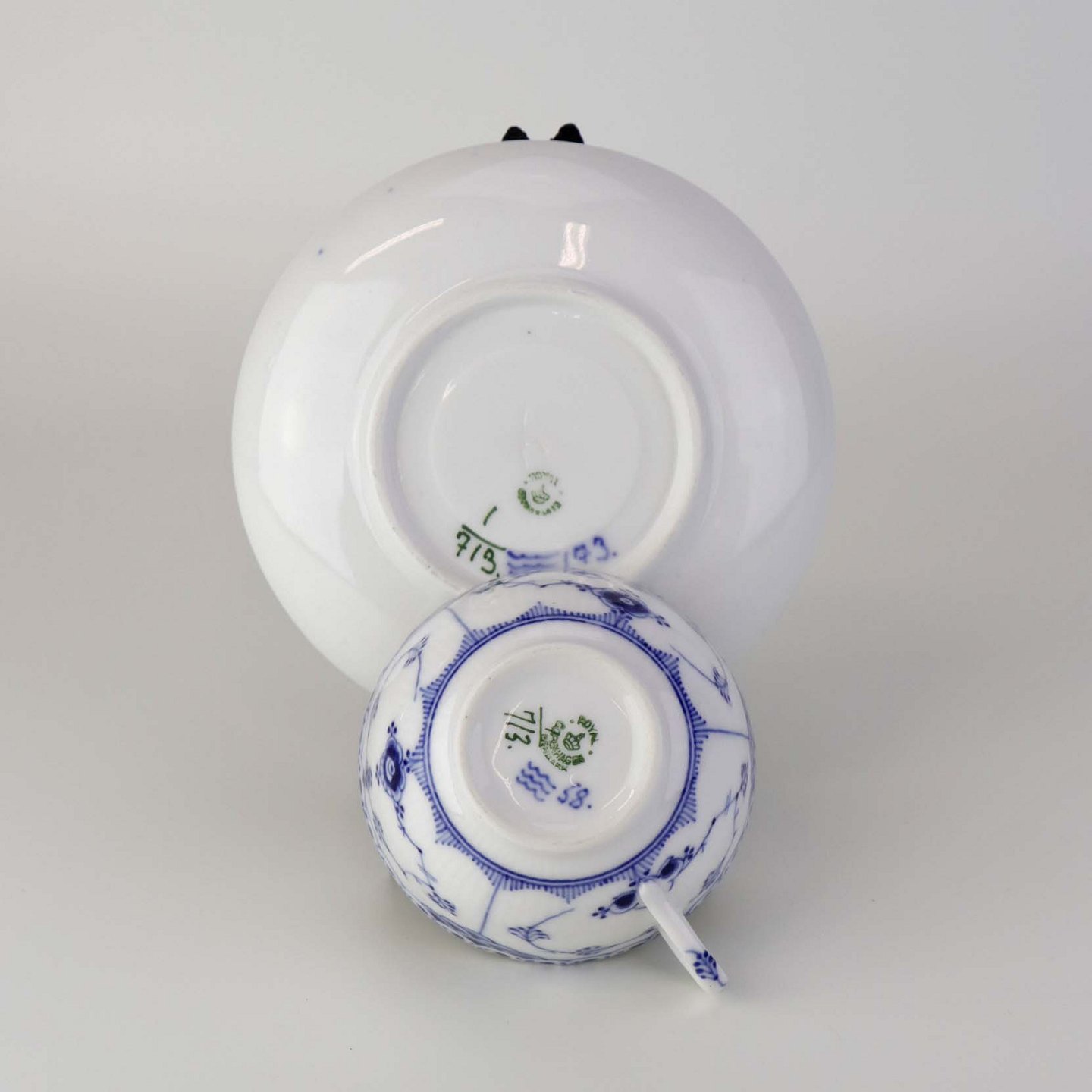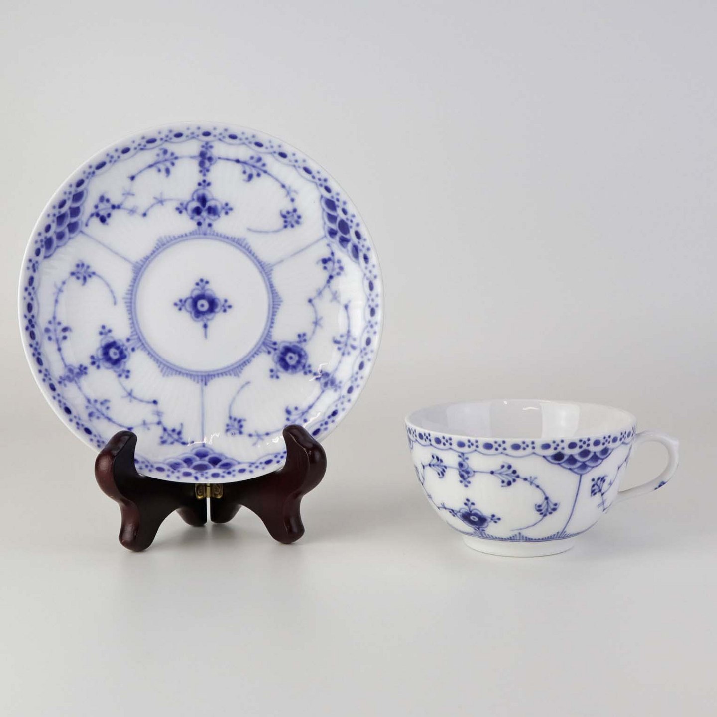 Mellemstor tekop med underkop i kongeligt porcelæn fra stellet Musselmalet Halvblonde. Nr. 1/713