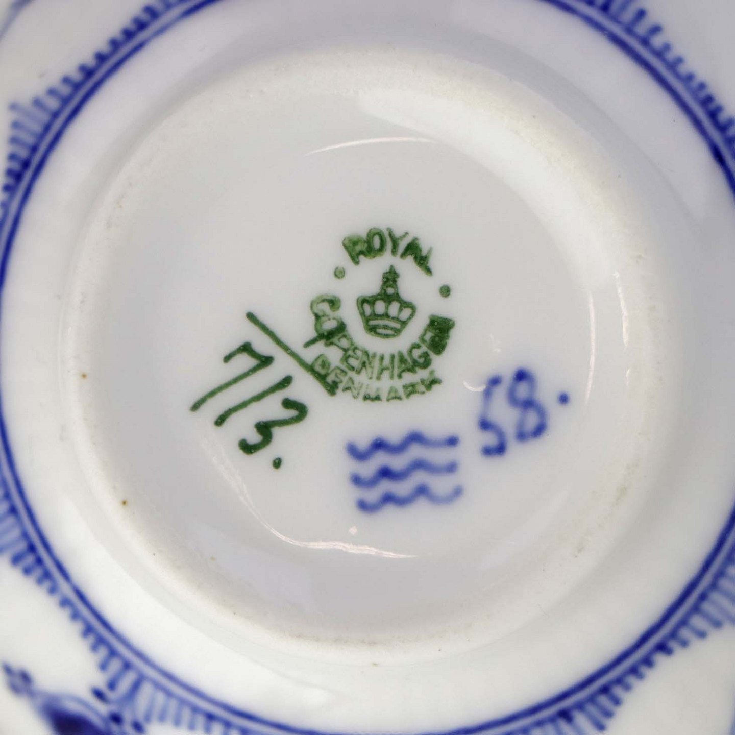 Musselmalet halvblonde er riflet hvidt porcelæn med dekoration af blå ranker og en kant med blonder.