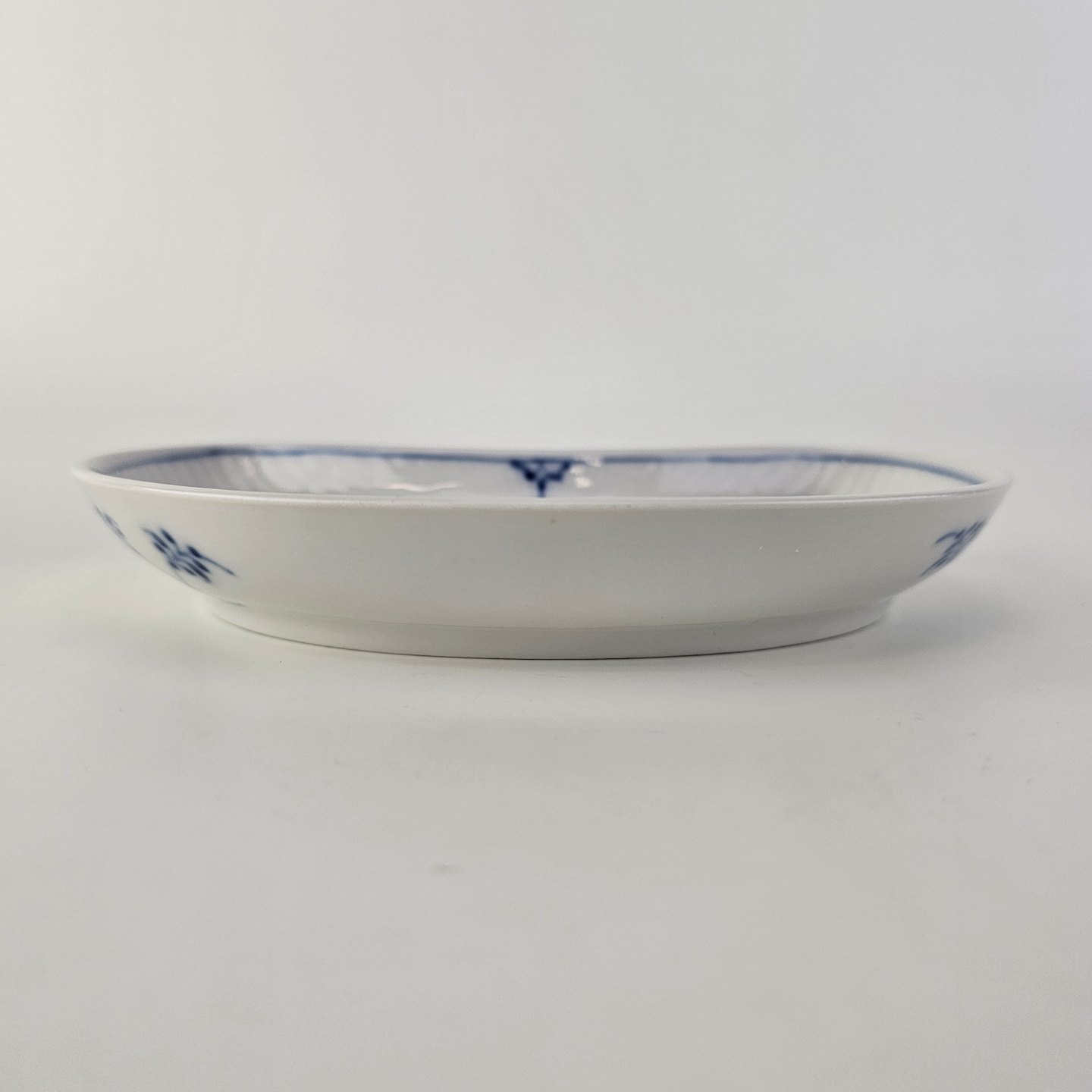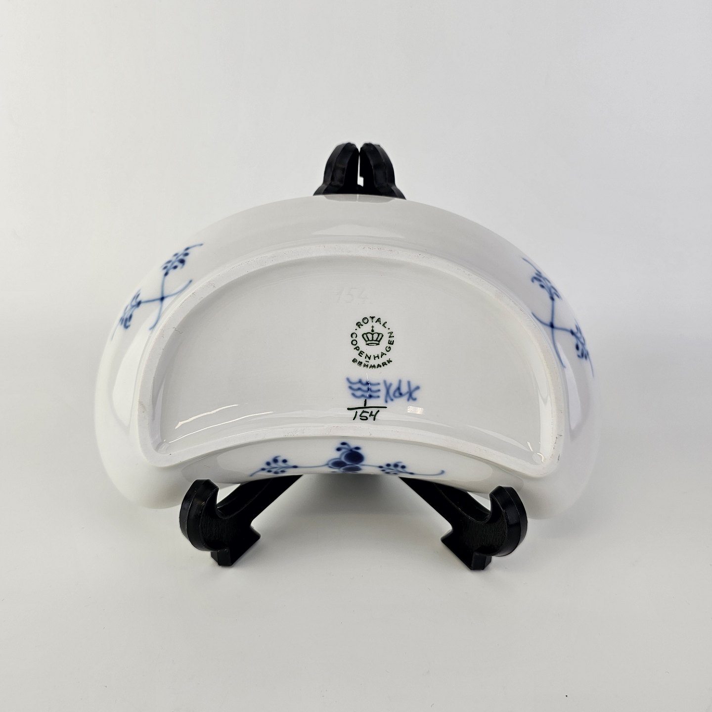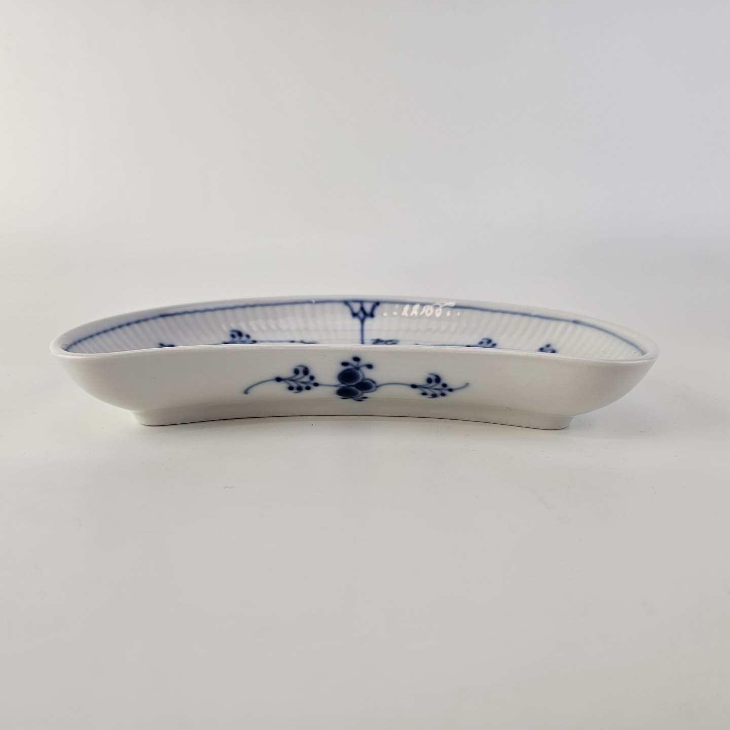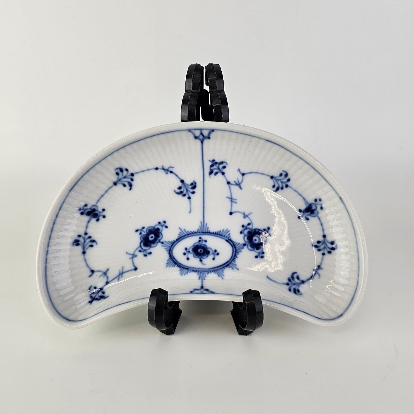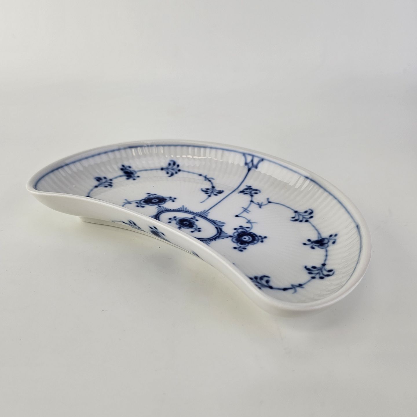 Halvmåneformet fad i kongeligt porcelæn fra stellet Musselmalet Halvblonde