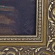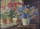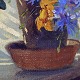 Oliemaleri på lærred i guldmalet træramme med stilleben motiv af blomster i vindueskarm.