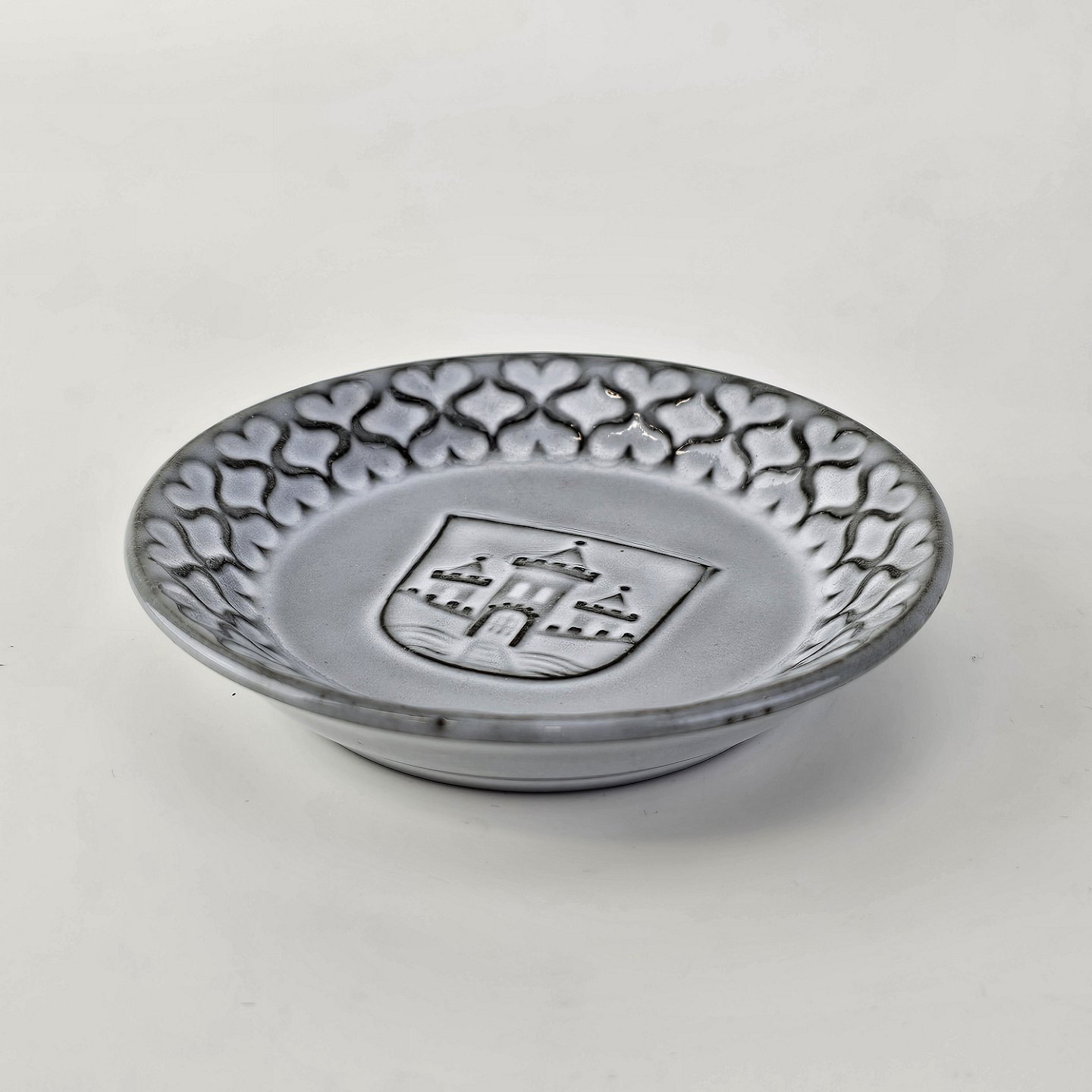 Kuvert askebægre af stentøj fra stellet Grå Cordial med Randers Byvåben