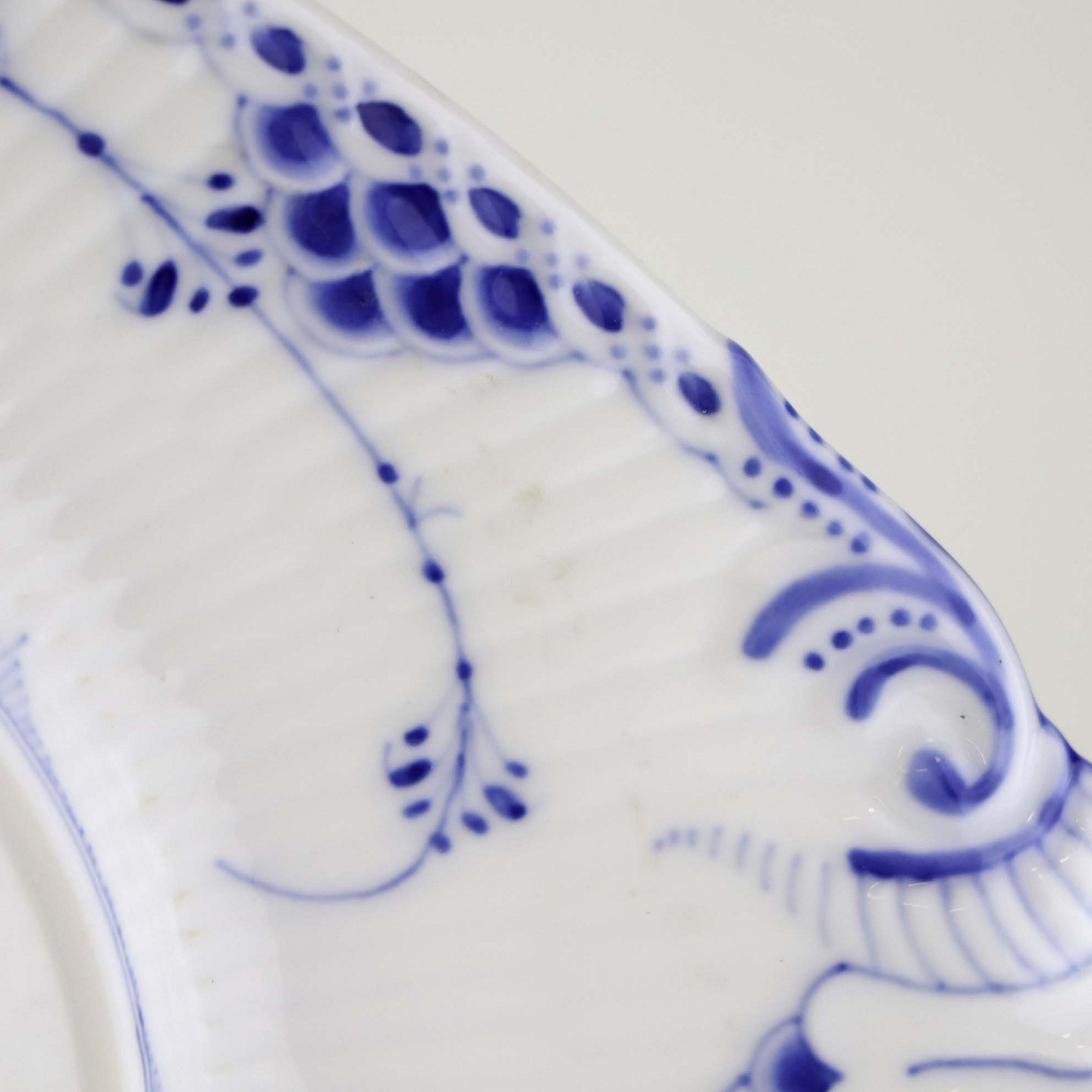 Musselmalet halvblonde er riflet hvidt porcelæn med dekoration af blå ranker og en kant med blonder.