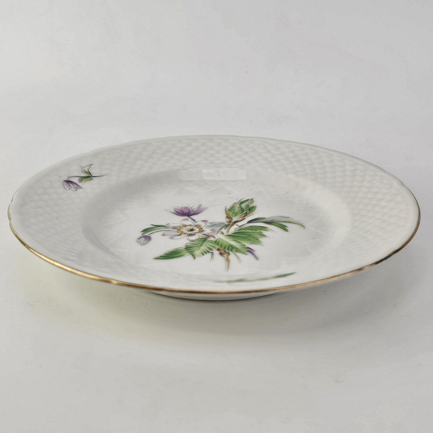 Frigga Anemone er cremefarvet porcelæn dekoreret med motiv af anemoner og bøgeløv med guldkant