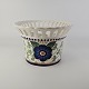 Oval jardiniere med låg i fajance med dekoration af en blå blomst og grønne blade. Nr. 1042/720
