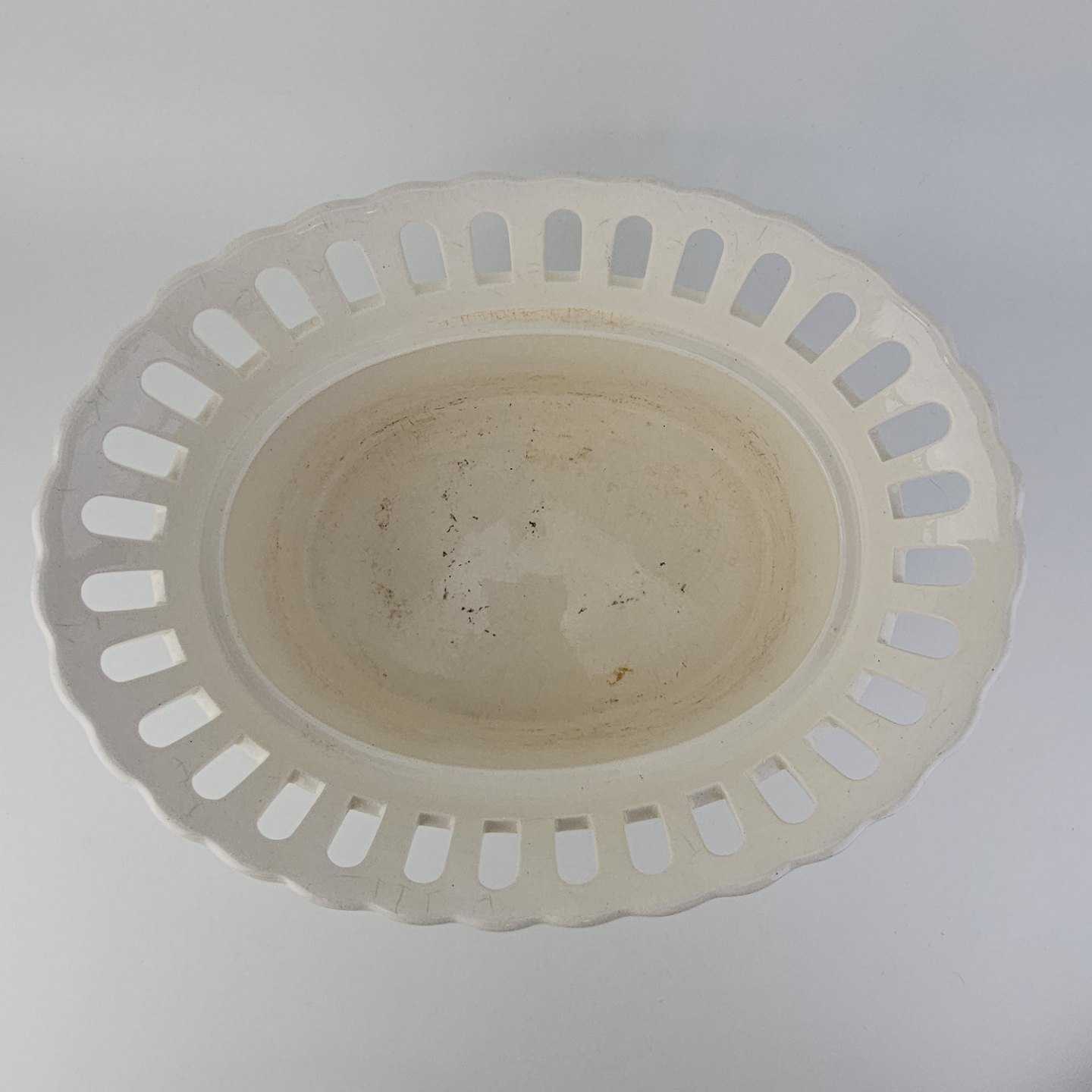 Fremstår med krakeleringer og brugsspor på indersiden