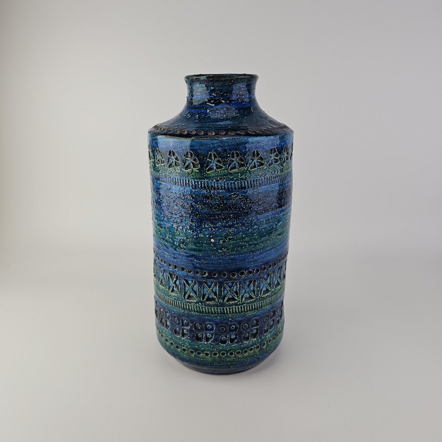 Vase af keramik med rimini blå glasering og geometriske mønstre