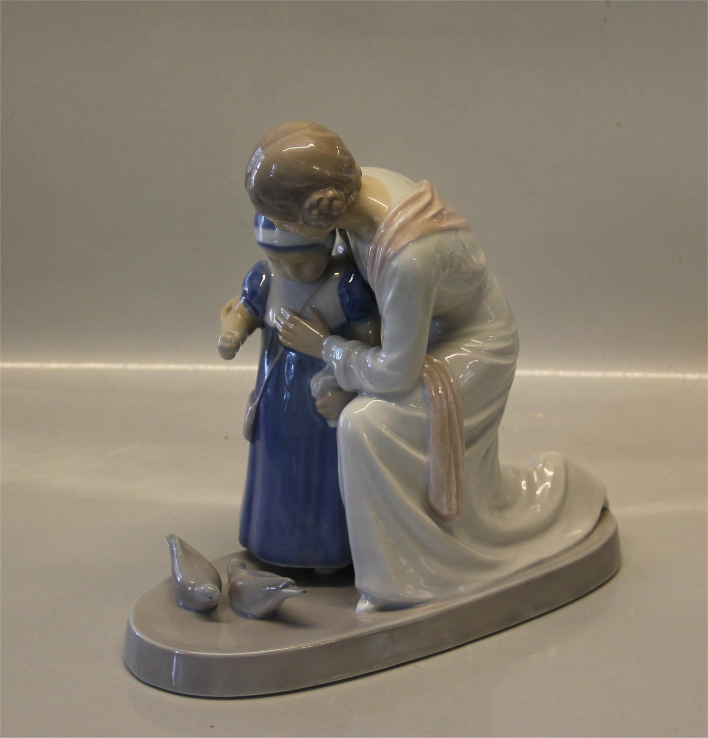 Beskrivelse: Bing & Grøndahl B&G 1625 Else fodre fugle - duer - sammen med sin mor 23,5 x 24,5 cm. I fin og hel stand.