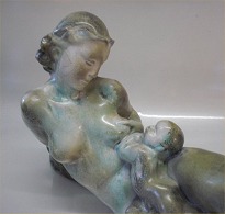 Beskrivelse: Royal Copenhagen stentøj Unika fugl "Alk" (Alca torda) med fisk Knud Kyhn 32 cm Unique - Mærket med de tre Bølgelinier, KK 1931 Lækker Olivin glasur