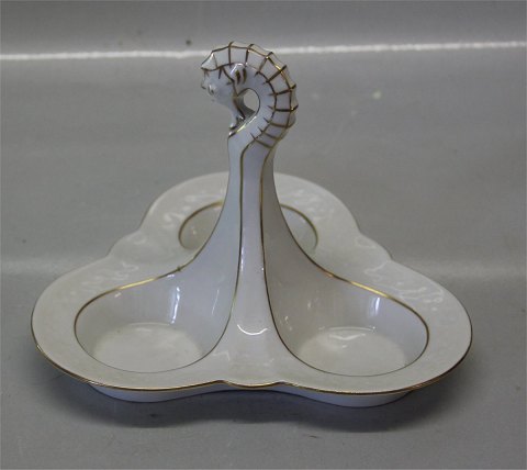 Beskrivelse: Bing & Grøndahl Hartmann 052 Trekantet plat de menage med søhestehank 13 x 16,5 cm Hvidt porcelæn med dobbel guldkant. Bing & Groendahl I hel og fin stand