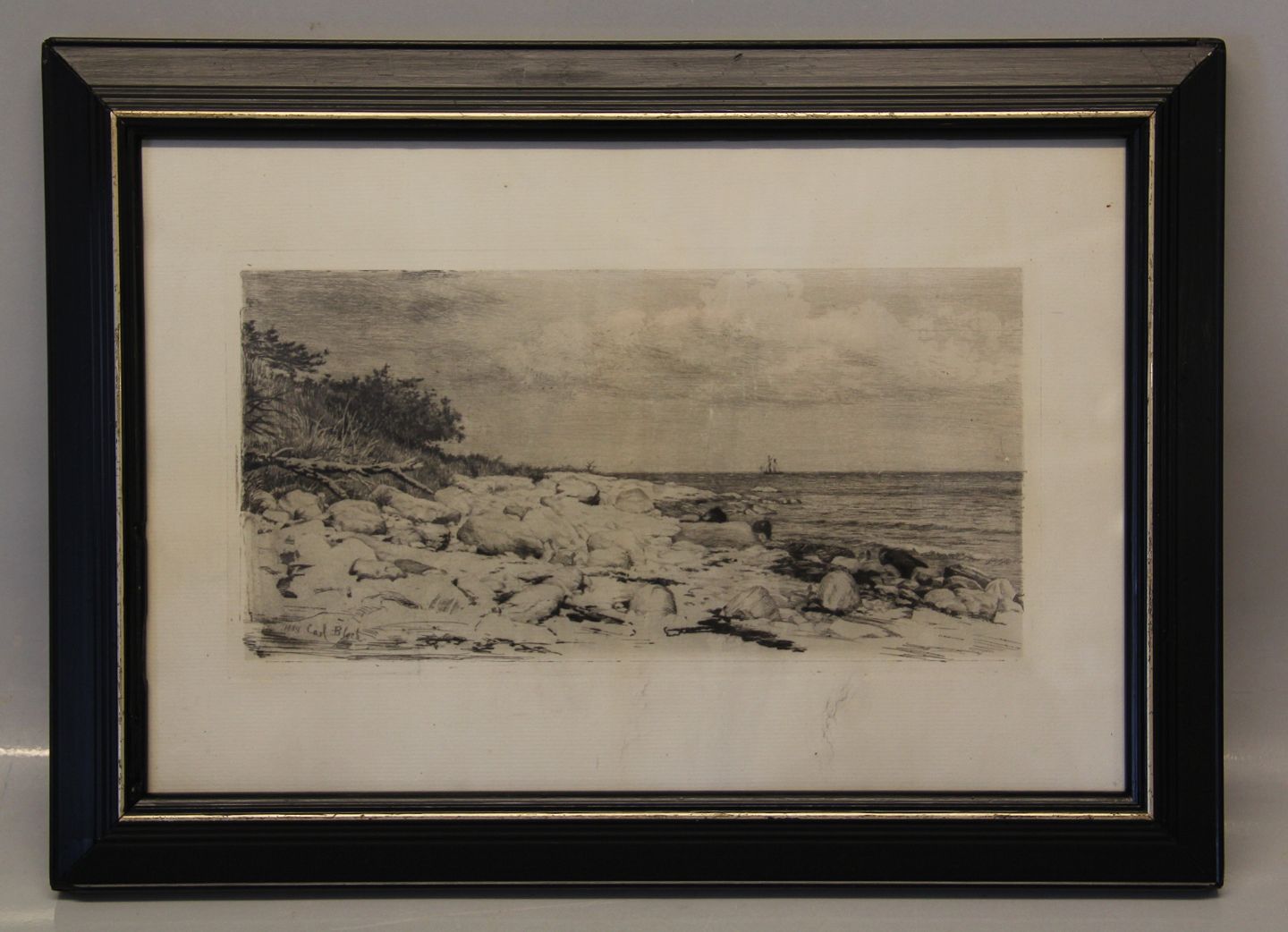 Carl Bloch Radering af kystlandskab 1889 29 x 40 cm iinklusiv gl. sort træramme