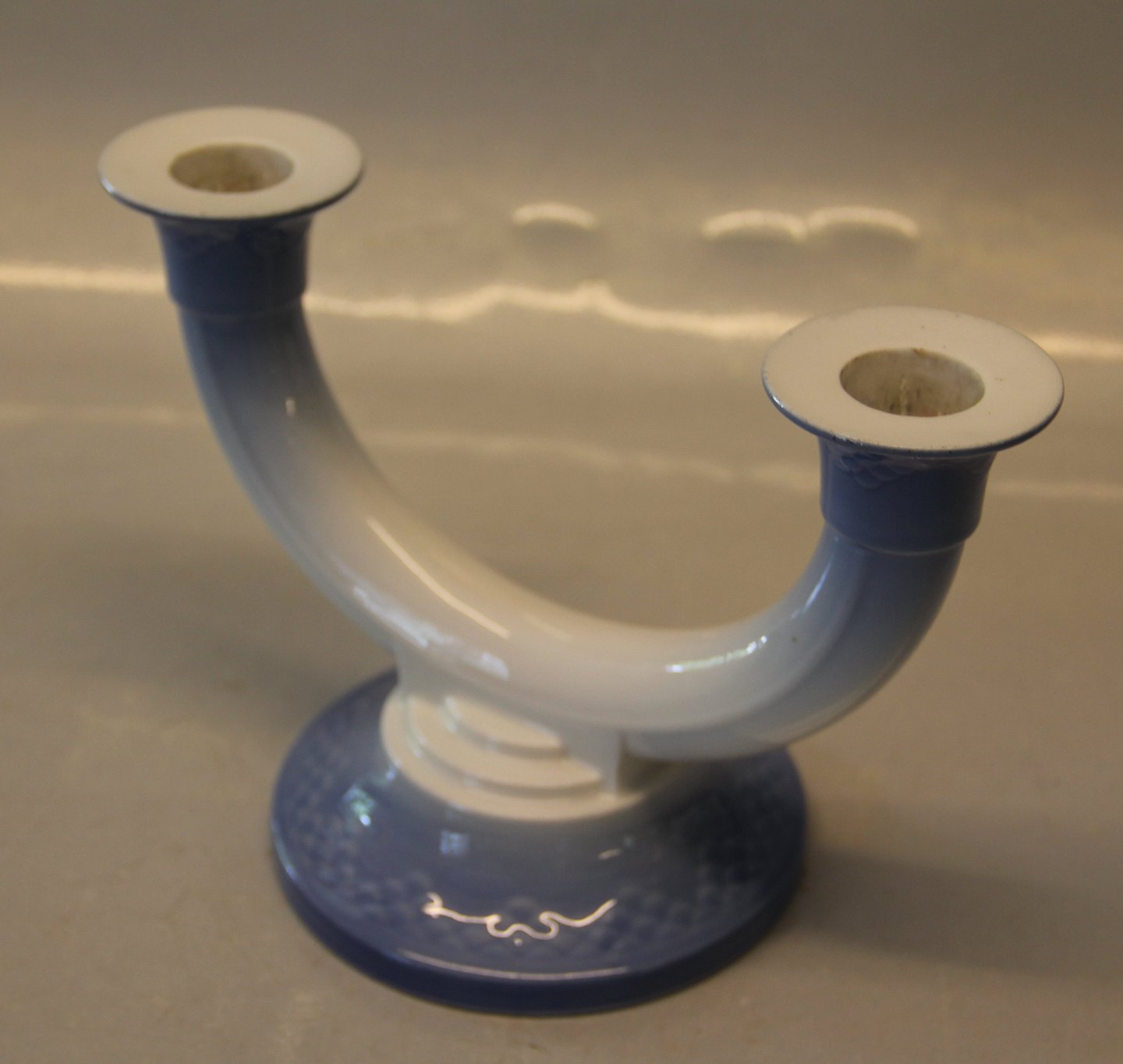 Beskrivelse: Bing & Grøndahl Blå Tone 235 To-armet lysestage 13,5 cm I hel og fin stand Blue Tone Seashell