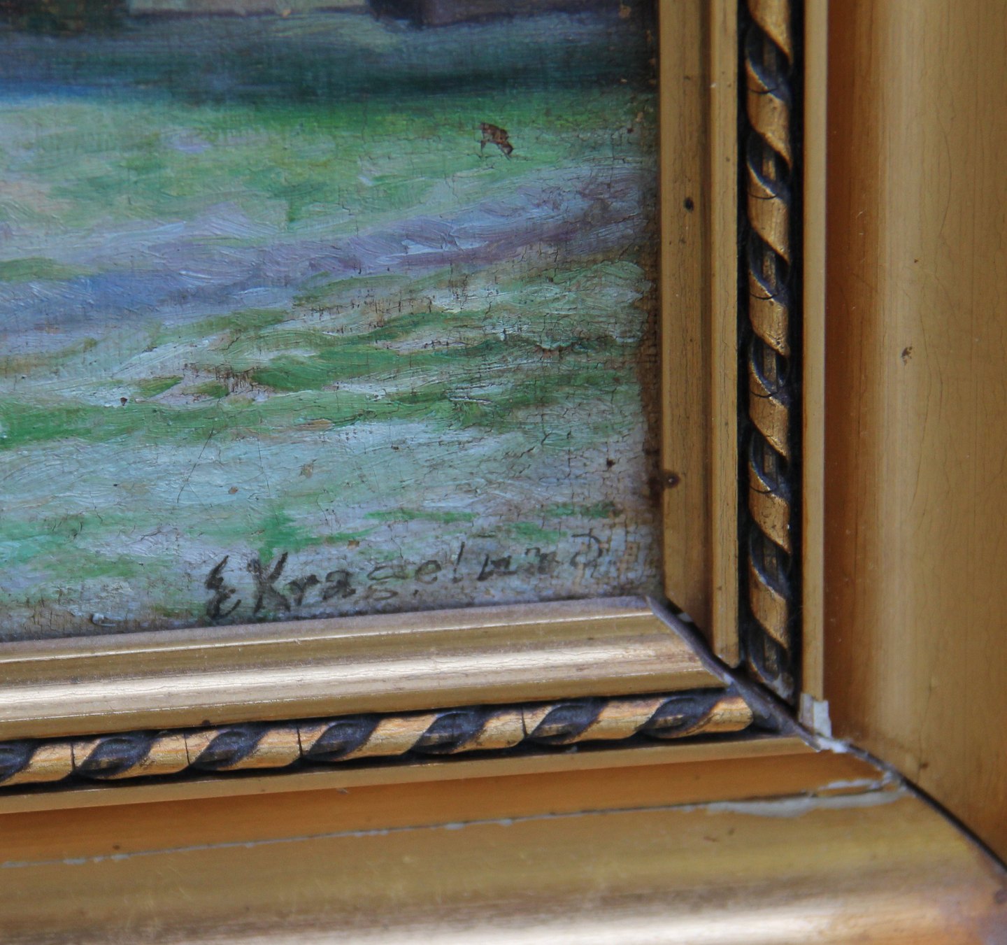 Beskrivelse: Maleri fra Mariager Museum - Købmandsgården 50 x 36 cm Guldramme med brugsspor Signeret EKragelund Ellen Marie Kragelund
