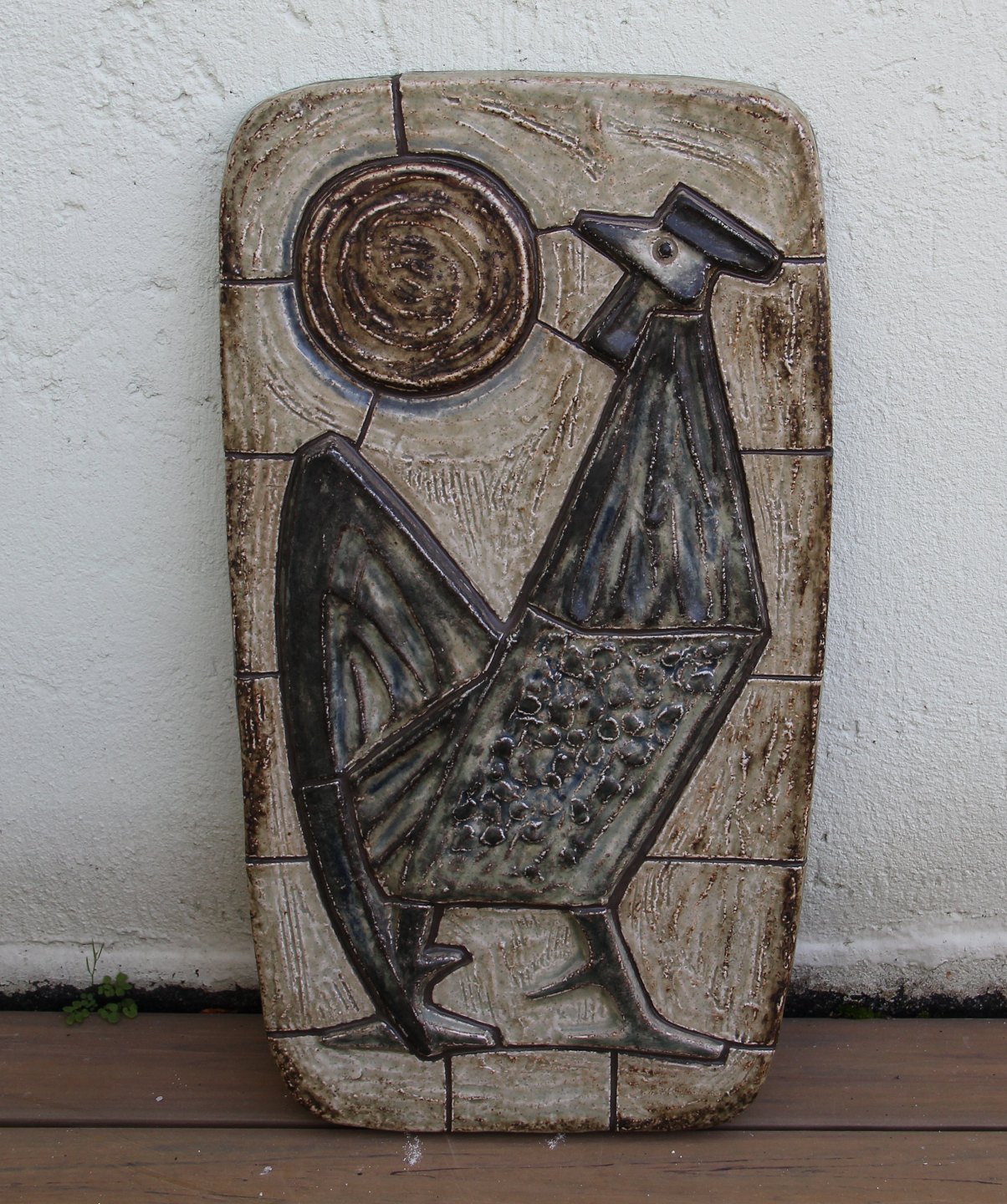 Description: Unique Royal Copenhagen Stoneware RC Relief Cock and the Morning Sun 66 x 38 cm JM Joergen Mogensen . In nice and mint condition Ca 1962