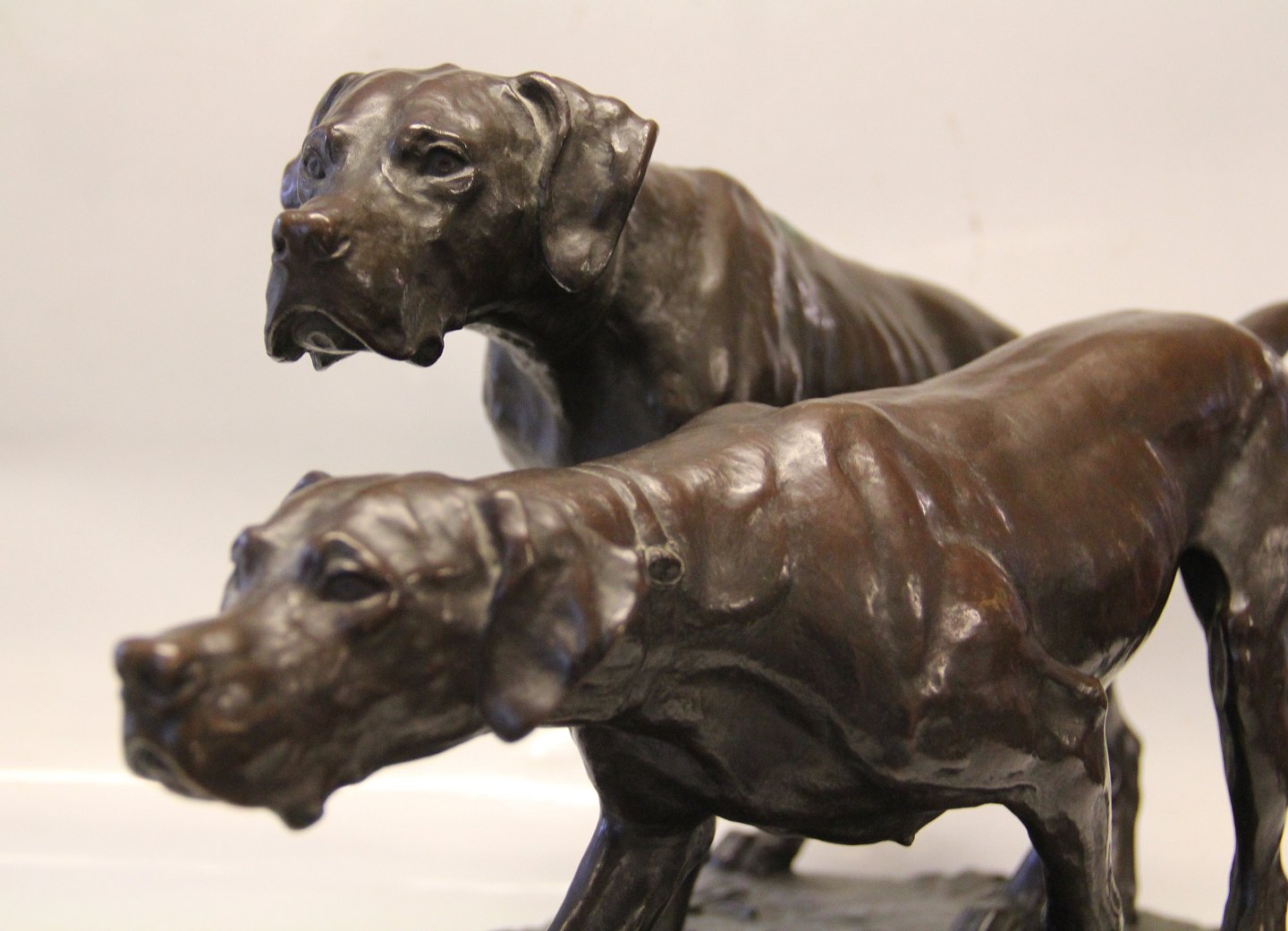 Beskrivelse: Sætter gruppe i bronze ca 24 x 50 cm Lauritz Jensen Vigtig hunde skulptur som også blev lavet for Dahl Jensen 1278 setter